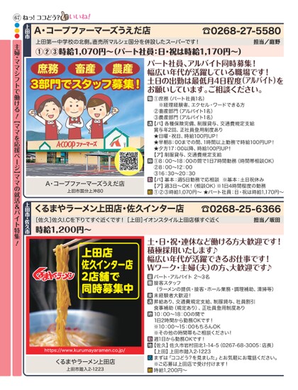 パート社員、アルバイト同時募集!幅広い年代が活躍している職場です!土日の出勤は最低月4日程度(アルバイト)をお願いしています。ご相談ください。①庶務(パート社員1名)※経理経験者、エクセル・ワードできる方②畜産部門(アルバイト1名)③農産部門(アルバイト1名)【パ】各種保険完備、制服貸与、交通費規定支給賞与年2回、正社員登用制度あり★日曜・祝日、時給100円UP!★早朝8:00までの間、1時間以上勤務で時給100円UP!★夕方17:00以降、時給100円UP!【ア】制服貸与、交通費規定支給①8:00〜18:00の間で1日7時間勤務(時間帯相談OK)②8:00〜12:00③16:30〜20:30【パ】基本:週5日勤務で応相談※基本:土日祝休み【ア】週3日〜OK!(相談OK)※1日4時間程度の勤務①②③時給1,070円〜★パート社員:日・祝は時給1,170円〜A・コープファーマーズうえだ店上田市国分上沖80くるまやラーメン上田店・佐久インター店☎0268-25-6366[佐久]佐久I.Cを下りてすぐ近くです![上田]イオンスタイル上田店様すぐ近く時給1,200円〜担当/坂田上田店佐久インター店2店舗で同時募集中https://www.kurumayaramen.co.jp/くるまやラーメン上田店上田市踏入2-1223土・日・祝・連休など働ける方大歓迎です!積極採用いたします♪幅広い年代が活躍できるお仕事です!Wワーク・主婦(夫)の方、大歓迎です♪パート・アルバイト2〜3名接客スタッフ(ラーメンの提供・接客・ホール業務・調理補助、清掃等)未経験者大歓迎!昇給あり、交通費規定支給、制服貸与、社員割引食事補助(規定あり)、正社員登用制度あり10:00〜18:00の間で1日2時間から勤務OKです!※10:00〜15:00もちろんOK※その他の時間帯もご相談ください!週1日から勤務OKです!【佐久】佐久市岩村田北1-14-5(0267-68-3005:店長)【上田】上田市踏入2-1223まずは「ココどう?を見ました」とお気軽にお電話ください。※ご応募は上田店で受け付けます!時給1,200円〜上田第一中学校の北側。直売所マルシェ国分を併設したスーパーです!①②③時給1,070円〜(パート社員:日・祝は時給1,170円〜)☎0268-27-5580担当/庭野A・コープファーマーズうえだ店上田市●●●67ねっ!ココどう?庶務畜産農産3部門でスタッフ募集!主婦・ママシフトで働ける!【ママを応援ページ】ママの就活&バイト特集上田市・佐久市!