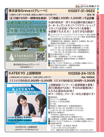 アルバイトは土日祝働ける方歓迎!●●●68主婦・ママシフトで働ける!【ママを応援ページ】ママの就活&バイト特集!担当/採用担当上田駅お城口から徒歩2分、お城口信号」の角です①1コマ(120分)2,950円〜5,000円②1コマ(90分)2,300円〜3,900円上田駅前校マンツーマン指導教師大募集!週1日勤務からOK!平日のみ勤務OK!もちろん週末のみOK!Wワークの方、フリーターの方大歓迎です♪上田駅前校、上田原校、東御校、佐久岩村田校、小諸駅前校マンツーマン指導教師大募集業務委託マンツーマン指導教師大卒以上※大学生応相談2〜3名昇給あり、補助手当あり、社員登用制度あり[平日]16:00〜22:00の間で1コマからOK[土日]10:00〜20:00の間で1コマからOK週1日から勤務OK!※平日のみ、週末のみなどもOK!※指導可能な日時に合わせて勤務OKです♪上田駅前校、上田原校、東御校、佐久岩村田校、小諸駅前校まずは「ココどう?を見ました」とお気軽にお電話ください。[指導対象学年](A)小・中学生(B)高校生・既卒生※(A)か(B)のどちらか又は両方テスト・受験対策や学校の授業のサポートなどを行います!1コマ120分2,950円〜5,000円1コマ90分2,300円〜3,900円https://katekyo-nagano.com/KATEKYO上田駅前校上田市中央1-1-22桝林本店ビル2F☎0268-24-1515KATEKYO上田駅前校上田市小諸駅から車で10分程度、飯綱山公園内でのお仕事です!担当/泉【正】月給19万円〜(経験者応相談)【ア】時給1,100円〜1,500円※下記詳細☎0267-31-5622株式会社Greve.t(グレーベ)小諸市話題の複合施設STARRACEKOMORO正社員・アルバイトを募集<スタラス小諸>株式会社Greve.t(グレーベ)小諸市諸東房151-1小諸の景色が一望できる話題の複合施設でホール・キッチンスタッフ・ワイナリーショップスタッフ(正社員・アルバイト)を募集!未経験でも大丈夫!土日できる方歓迎!①レストランホール・キッチンスタッフ(イタリアン&カフェ・焼肉・鉄板焼)②ワイナリーショップスタッフ(ショップにて接客・商品管理業務)社会保険完備(正社員は社保と寮完備)交通費規定支給、制服貸与、昇給あり、社員割引、賄いあり清潔感があれば髪色・ネイル自由【正】①7:00〜22:00の間で実働8時間(シフト制)②9:00〜18:00の間で実働8時間(シフト制)【ア】①7:00〜22:00の間で1日4〜8時間勤務OK!②9:00〜18:00の間で1日4〜8時間勤務OK!【正】週休2日制(シフト制)【ア】週2〜5日勤務OK!(シフト制・応相談)※勤務時間・勤務日は季節により変動あり小諸市諸東房151-1まずは「ココどう?を見ました」とお気軽にお電話ください。【正】月給190,000円〜(経験者応相談)【ア】時給1,100円〜1,500円