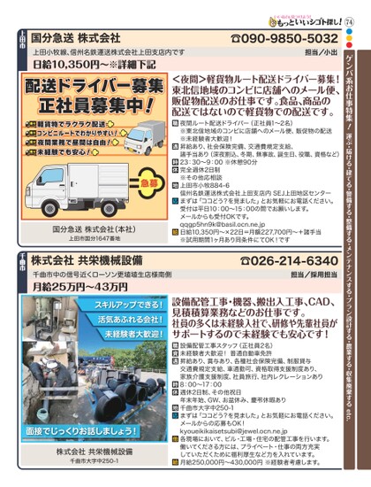 74●●●ゲンバ系お仕事特集!運ぶ・届ける・建てる・警備する・整備する・メンテナンスする・プラン設計する・農業する・収集廃棄するetc.<夜間>軽貨物ルート配送ドライバー募集!東北信地域のコンビに店舗へのメール便、販促物配送のお仕事です。食品、商品の配送ではないので軽貨物での配送です。夜間ルート配送ドライバー(正社員1〜2名)※東北信地域のコンビに店舗へのメール便、販促物の配送※未経験者大歓迎!昇給あり、社会保険完備、交通費規定支給、諸手当あり(深夜割込、冬期、無事故、誕生日、役職、資格など)23:30〜9:00※休憩90分完全週休2日制※その他応相談上田市小牧884-6信州名鉄運送株式会社上田支店内SEJ上田地区センターまずは「ココどう?を見ました」とお気軽にお電話ください。受付は平日10:00〜15:00の間でお願いします。メールからも受付OKです。qqgp5hn9k@basil.ocn.ne.jp日給10,350円〜×22日=月額227,700円〜+諸手当※試用期間1ヶ月あり同条件にてOK!です☎026-214-6340担当/採用担当配送ドライバー募集正社員募集中!楽々軽貨物でラクラク配送楽々コンビニルートでわかりやすい!楽々夜間業務で昼間は自由!楽々未経験でも安心!急募国分急送株式会社(本社)上田市国分1647番地株式会社共栄機械設備千曲市中の信号近くローソン更埴埴生店様南側月給25万円〜43万円千曲市☎090-9850-5032担当/小出国分急送株式会社上田小牧線、信州名鉄運送株式会社上田支店内です日給10,350円〜※詳細下記上田市スキルアップできる!活気あふれる会社!未経験者大歓迎!設備配管工事・機器、搬出入工事、CAD、見積積算業務などのお仕事です。社員の多くは未経験入社で、研修や先輩社員がサポートするので未経験でも安心です!設備配管工事スタッフ(正社員2名)未経験者大歓迎!普通自動車免許昇給あり、賞与あり、各種社会保険完備、制服貸与交通費規定支給、車通勤可、資格取得支援制度あり、家族介護支援制度、社員旅行、社内レクレーションあり8:00〜17:00週休2日制、その他祝日年末年始、GW、お盆休み、慶弔休暇あり千曲市大字中250-1まずは「ココどう?を見ました」とお気軽にお電話ください。メールからの応募もOK!kyoueikikaisetsubi@jewel.ocn.ne.jp各現場において、ビル・工場・住宅の配管工事を行います。働いてくださる方には、プライベート・仕事の両方充実していただくために福利厚生など力を入れています。月給250,000円〜430,000円※経験者考慮します。面接でじっくりお話しましょう!株式会社共栄機械設備千曲市大字中250-1