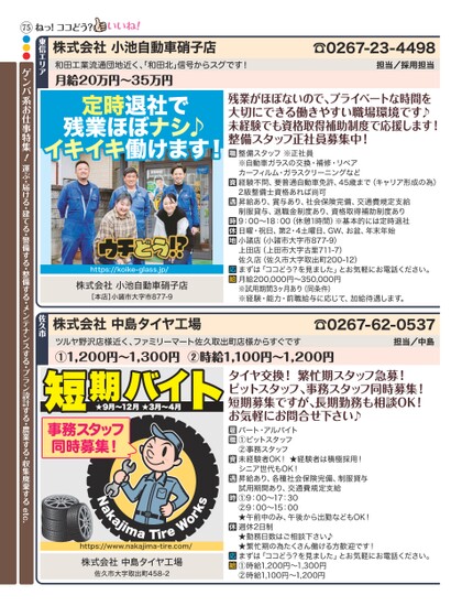 ☎0267-62-0537担当/中島タイヤ交換!繁忙期スタッフ急募!ピットスタッフ、事務スタッフ同時募集!短期募集ですが、長期勤務も相談OK!お気軽にお問合せ下さい♪パート・アルバイト①ピットスタッフ②事務スタッフ未経験者OK!★経験者は積極採用!シニア世代もOK!昇給あり、各種社会保険完備、制服貸与試用期間あり、交通費規定支給①9:00〜17:30②9:00〜15:00★午前中のみ、午後から出勤などもOK!週休2日制★勤務日数はご相談下さい♪★繁忙期の為たくさん働ける方歓迎です!まずは「ココどう?を見ました」とお気軽にお電話ください。①時給1,200円〜1,300円②時給1,100円〜1,200円☎0267-23-4498担当/採用担当株式会社小池自動車硝子店和田工業流通団地近く、和田北」信号からスグです!月給20万円〜35万円東信エリアねっ!ココどう?定時退社で残業ほぼナシ♪イキイキ働けます!https://koike-glass.jp/株式会社小池自動車硝子店[本店]小諸市大字市877-9残業がほぼないので、プライベートな時間を大切にできる働きやすい職場環境です♪未経験でも資格取得補助制度で応援します!整備スタッフ正社員募集中!整備スタッフ※正社員※自動車ガラスの交換・補修・リペアカーフィルム・ガラスクリーニングなど経験不問、要普通自動車免許、45歳まで(キャリア形成の為)2級整備士資格あれば尚可昇給あり、賞与あり、社会保険完備、交通費規定支給制服貸与、退職金制度あり、資格取得補助制度あり9:00〜18:00(休憩1時間)※基本的には定時退社日曜・祝日、第2・4土曜日、GW、お盆、年末年始小諸店(小諸市大字市877-9)上田店(上田市大字古里711-7)佐久店(佐久市大字取出町200-12)まずは「ココどう?を見ました」とお気軽にお電話ください。月給200,000円〜350,000円※試用期間3ヶ月あり(同条件)※経験・能力・前職給与に応じて、加給待遇します。ツルヤ野沢店様近く、ファミリーマート佐久取出町店様からすぐです①1,200円〜1,300円②時給1,100円〜1,200円株式会社中島タイヤ工場佐久市期短★9月〜12月★3月〜4月バイト事務スタッフ同時募集!WorksaTierakajimNhttps://www.nakajima-tire.com/株式会社中島タイヤ工場佐久市大字取出町458-275●●●ゲンバ系お仕事特集!運ぶ・届ける・建てる・警備する・整備する・メンテナンスする・プラン設計する・農業する・収集廃棄するetc.