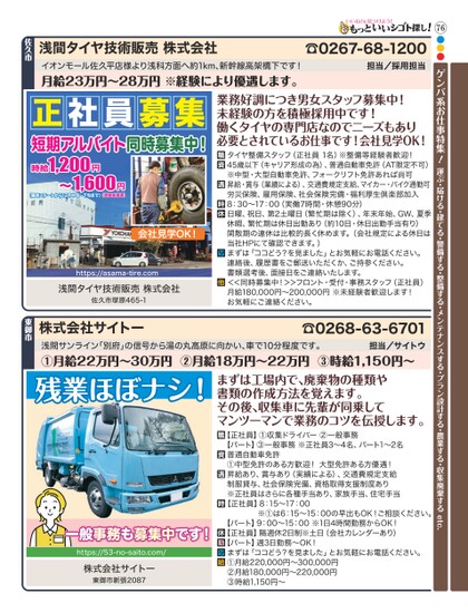 76●●●ゲンバ系お仕事特集!運ぶ・届ける・建てる・警備する・整備する・メンテナンスする・プラン設計する・農業する・収集廃棄するetc.【正社員】①収集ドライバー②一般事務【パート】③一般事務※正社員3〜4名、パート1〜2名普通自動車免許①中型免許のある方歓迎!大型免許ある方優遇!昇給あり、賞与あり(実績による)、交通費規定支給制服貸与、社会保険完備、資格取得支援制度あり※正社員はさらに各種手当あり、家族手当、住宅手当【正社員】8:15〜17:00※①は6:15〜15:00の早出もOK!ご相談ください。【パート】9:00〜15:00※1日4時間勤務からOK!【正社員】隔週休2日制※土日(会社カレンダーあり)【パート】週3日勤務〜OK!まずは「ココどう?を見ました」とお気軽にお電話ください。①月給220,000円〜300,000円②月給180,000円〜220,000円③時給1,150円〜一般事務も募集中です!https://53-no-saito.com/株式会社サイトー東御市新張2087☎0267-68-1200担当/採用担当イオンモール佐久平店様より浅科方面へ約1km、新幹線高架橋下です!月給23万円〜28万円※経験により優遇します。浅間タイヤ技術販売株式会社佐久市正社員募集短期アルバイト同時募集中!1,200円時給1,600円〜(随時スタートから12月中旬〜下旬まで)(経験者優遇)会社見学OK!https://asama-tire.com浅間タイヤ技術販売株式会社佐久市塚原465-1業務好調につき男女スタッフ募集中!未経験の方を積極採用中です!働くタイヤの専門店なのでニーズもあり必要とされているお仕事です!会社見学OK!タイヤ整備スタッフ(正社員1名)※整備等経験者歓迎!45歳以下(キャリア形成の為)、普通自動車免許(AT限定不可)※中型・大型自動車免許、フォークリフト免許あれば尚可昇給・賞与(業績による)、交通費規定支給、マイカー・バイク通勤可労災保険、雇用保険、社会保険完備・福利厚生倶楽部加入8:30〜17:00(実働7時間・休憩90分)日曜、祝日、第2土曜日(繁忙期は除く)、年末年始、GW、夏季休暇、繁忙期は休日出勤あり(約10日・休日出勤手当有り)閑散期の連休は比較的長く休めます。(会社規定による休日は当社HPにて確認できます。)まずは「ココどう?を見ました」とお気軽にお電話ください。連絡後、履歴書をご郵送いただくか、ご持参ください。書類選考後、面接日をご連絡いたします。<<同時募集中!>>フロント・受付・事務スタッフ(正社員)月給180,000円〜200,000円※未経験者歓迎します!お気軽にご連絡ください。浅間サンライン「別府」の信号から湯の丸高原に向かい、車で10分程度です。①月給22万円〜30万円②月給18万円〜22万円③時給1,150円〜担当/サイトウ残業ほぼナシ!まずは工場内で、廃棄物の種類や書類の作成方法を覚えます。その後、収集車に先輩が同乗してマンツーマンで業務のコツを伝授します。☎0268-63-6701株式会社サイトー東御市