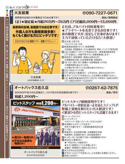 長野県内全域の大手量販店でのお仕事です!担当/採用担当[正]★固定給★月給20万円〜35万円[ア]日給8,000円〜13,000円長野県内全域、各施設でのお仕事です♪☎090-7227-0671大友総業上田市ねっ!ココどう?外国人の方も勤務実績多数!もくもく働ける方にピッタリです♪【固定給】月給20万円〜35万円以上!正社員、アルバイト同時募集中!★プライベートを充実できるお仕事です!夜の勤務ですが、安定して仕事があります!主力で頑張っていただける方!大歓迎♪正社員※若干名アルバイト※2〜3名商業施設清掃スタッフ(夜間清掃)大型施設、家電量販店、子ども服販売店・家具・インテリア販売店等[正]50歳まで(キャリア形成のため)、要普通自動車免許[ア]必要なし、年齢不問です♪経験者優遇します!昇給あり(昇給随時・頑張れば給与UP)交通費規定支給、社会保険完備、制服貸与18:00〜翌3:00(実働4〜5時間程度※平均)※移動時間も含んでいます。※仕事が早く終了しても日給は変わりません![正]月6日(シフト制)[ア]週1日から勤務OK!※平日のみ、週末のみOKです!まずは「ココどう?を見ました」とお気軽にお電話ください。[正]★固定給★月給20万円〜35万円※研修中:日給8,000円[ア]日給8,000円〜13,000円☎0267-62-7875担当/芹沢オートバックス佐久店BOOKOFF佐久中込店様近く、ツルヤ佐久中央店様目の前です!時給1,200円〜佐久市ピットスタッフ時給1,200円〜★週3日〜勤務OK!★平日のみ勤務も相談OK!https://recruit.wadasho.co.jp/オートバックス佐久店佐久市中込立石2985ピットスタッフ積極採用中です!アルバイト→契約社員→正社員とステップUP整備士資格を取りたい方大歓迎です♪<歓迎>女性ピットスタッフも活躍できます!パート・アルバイトピットスタッフ※Wワーク・学生・フリーターどなたもOK!未経験からスタートできます!学生でも働けます!※普通自動車免許必須1〜2名昇給あり、社会保険完備、交通費規定支給制服貸与、社員割引あり、正社員登用あり9:45〜19:10の間で1日6〜8時間勤務でOK!週3日から勤務OK!★「平日のみ」も相談OK!★テスト期間のシフトも考慮します!★曜日・時間帯のご相談に応じます♪佐久市中込立石2985まずは「ココどう?を見ました」とお気軽にお電話ください。時給1,200円〜大友総業上田市常磐城5-3-3177●●●ゲンバ系お仕事特集!運ぶ・届ける・建てる・警備する・整備する・メンテナンスする・プラン設計する・農業する・収集廃棄するetc.