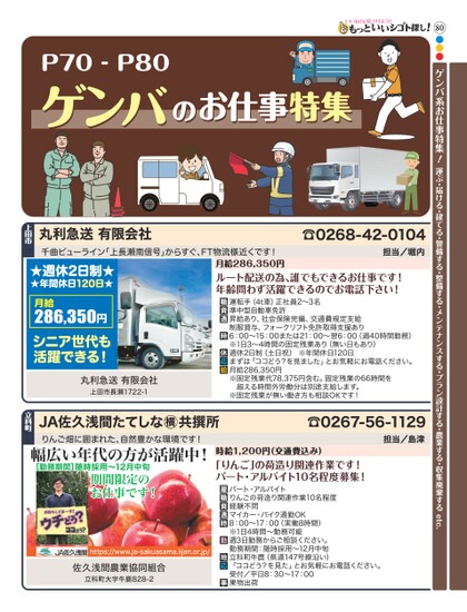 80●●●ゲンバ系お仕事特集!運ぶ・届ける・建てる・警備する・整備する・メンテナンスする・プラン設計する・農業する・収集廃棄するetc.P70-P80ゲンバゲンバお仕事特集お仕事特集のの★週休2日制★★年間休日120日★月給286,350円シニア世代も活躍できる!丸利急送有限会社上田市長瀬1722-1☎0268-42-0104担当/堀内月給286,350円ルート配送の為、誰でもできるお仕事です!年齢問わず活躍できるのでお電話下さい!運転手(4t車)正社員2〜3名準中型自動車免許昇給あり、社会保険完備、交通費規定支給制服貸与、フォークリフト免許取得支援あり6:00〜15:00または21:00〜翌6:00(週40時間勤務)※1日3〜4時間の固定残業あり(無い日もあり)週休2日制(土日祝)※年間休日120日まずは「ココどう?を見ました」とお気軽にお電話ください。月給286,350円※固定残業代78,375円含む。固定残業の66時間を超える時間外労働分は別途支給します。※固定残業が無い働き方も相談OKです!千曲ビューライン「上長瀬南信号」からすぐ、FT物流様近くです!丸利急送有限会社上田市☎0267-56-1129担当/島津時給1,200円(交通費込み)「りんご」の荷造り関連作業です!パート・アルバイト10名程度募集!パート・アルバイトりんごの荷造り関連作業10名程度経験不問マイカー・バイク通勤OK8:00〜17:00(実働8時間)※1日4時間〜勤務可能週3日勤務からご相談ください。勤務期間:随時採用〜12月中旬立科町牛鹿(県道147号線沿い)「ココどう?を見た」とお気軽にお電話ください。受付/平日8:30〜17:00果物出荷JA佐久浅間たてしな○横共所りんご畑に囲まれた、自然豊かな環境です!幅広い年代の方が活躍中!立科町[勤務期間]随時採用〜12月中旬期間限定のお仕事です!https://www.ja-sakuasama.iijan.or.jp/佐久浅間農業協同組合立科町大字牛鹿828-2