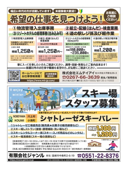 幅広い年代の方が活躍しています!未経験者大歓迎!希望の仕事を見つけよう!①物流管理入出庫事務③リゾートホテルの経理事務(住み込み可)②組立・配線(はんだ)・検査業務④道の駅レジ係及び軽作業お気軽にご相談ください!①物流管理入出庫事務冷凍庫内への入室あります正社員登用制度あり。上田市・派遣時給1,250円②組立・配線(はんだ)検査業務はんだ付け作業必須御代田町・派遣時給1,250円〜時間:7:20〜16:30の間で実働7時間50分休日:日・祝+その他(週休2日制)交通費規定支給時間:8:30〜17:30実働8時間休日:土・日(週休2日制)交通費規定支給③リゾートホテルの経理事務(住み込み可)遠方の方は個室寮あります!南牧村(八ヶ岳高原)・正社員月給円180,000〜235,000円時間:9:00〜18:00実働8時間休日:シフト制(週休2日制)交通費規定支給④道の駅レジ係及び軽作業レジ打ちと品出し等の軽作業!経験不問佐久市・派遣時給1,200円時間:早番8:00〜17:00実働8時間中番9:00〜18:00実働8時間遅番10:00〜19:00実働8時間休日:シフト制(週休2日制)交通費規定支給寮に入って仕事したい方もご相談ください。調理・清掃・事務などご案内出来ます!掲載以外のお仕事や職種を希望の方、お気軽にご相談ください。ホームページにてお仕事情報掲載!受付中!https://www.mti-jp.com/24時間登録株式会社エムテイアイ佐久市佐久平駅北26-3☎0267-66-3639厚生労働大臣許可●派遣:派20-110003/紹介:20-ユ-110002担当/採用担当スキー場スタッフ募集シャトレーゼスキーバレーお菓子屋さんの「シャトレーゼ」のスノーリゾートで働いてみませんか?NOBEYAMAKOUMI川上村小海町※業務内容により変動あり円円1,100時給1,200〜①シャトレーゼ工場直売店(販売員★お菓子の販売接客など)②スキー場レストラン(接客・調理補助・洗い場など)③スキーレンタルコーナー係(スキー・スノボ用品などのレンタル)④スキー場清掃係(スキー場の清掃など)【就業時間】7:00〜18:00もしくは7:00〜19:00までの間で1日8時間勤務(シフト制)【勤務日数】週2日から勤務OK!短期募集の為週5日で働ける方大歓迎です!※就業期間は12月1日から最長3月末頃までになります。【待遇、他】交通費規定支給・制服貸与・学生大歓迎・住込みOK・休日のスキー割引特典あり・食事補助有限会社ジャンル本社:韮崎市中島町2-6-19https://www.ganre.co.jp(派19-300028)19-ユ-300165)※雇用形態/派遣0551-22-8376不在時080-7884-5892(野島)