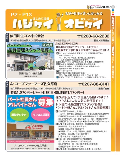 2●●●はじめて掲載!お久しぶり掲載特集!P2-P13はじめて掲載希望の仕事がきっとみつかるお久しぶり登場☎0268-68-2232担当/採用担当月給22万円〜25万円16:40が定時でプライベートも充実!未経験でも丁寧に教えますのでご安心ください!生コンクリートの品質管理スタッフ※正社員(若干名)※男女問いません!※コンクリートの強度、耐久性、施工性などの品質を確保するたの管理作業です。45歳以下(キャリア形成の為)、普通免許(AT限定不可)昇給あり、賞与あり、制服貸与、社会保険完備資格取得支援あり、交通費規定支給、皆勤手当あり退職金制度あり、有給休暇あり7:40〜16:40週休2日制(第1土曜日のみ出勤)祝日、GW、お盆、年末年始※会社カレンダーありまずは「ココどう?を見ました」とお気軽にお電話ください。R152「依田窪病院入口」信号をR254に入り、車で5分程度です!依田川生コン株式会社長和町生コンクリートの正社員品質管理スタッフ急募!依田川生コン株式会社長和町長久保13☎0267-88-8141担当/宮島佐久平駅から徒歩10分程度、フォレストモール佐久平にあります♪時給1,070円〜(パート社員:日・祝は時給1,170円〜)A・コープファーマーズ佐久平店佐久市パート社員さんアルバイトさん募集佐久平駅近くで、学生さんも通いやすい♪ママさんにも、大人気のお仕事です!レジ部門・日配部門でスタッフ募集!パート社員さん、アルバイトさん同時募集!通勤ラクラク!ママさん活躍!https://www.nagano-acoop.co.jp/store/sakudairaA・コープファーマーズ佐久平店佐久市岩村田5502番21(フォレストモール佐久平)①レジ部門(パート社員3名)★ラストまで働ける方積極採用!★土日祝働ける方募集中!②日配部門(パート社員1名)★早朝勤務できる方歓迎!③レジ部門(アルバイト1名)★週4日〜OK!(相談OKです)④日配部門(アルバイト1名)★週4日〜OK!(相談OKです)【パ】各種保険完備、制服貸与、交通費規定支給賞与年2回、正社員登用制度あり★日曜・祝日、時給100円UP!★早朝8:00までの間、1時間以上勤務で時給100円UP!★夕方17:00以降、時給100円UP!【ア】制服貸与、交通費規定支給①8:00〜20:00の間で1日7時間勤務②7:30〜16:30の間で1日7時間勤務③レジ部門(9:30〜16:30の間で4時間勤務)④日配部門(6:30〜10:30)【パ】基本:週5日勤務で応相談※基本:土日祝休み