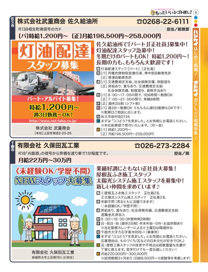 4●●●はじめて掲載!お久しぶり掲載特集!灯油配達スタッフ募集パート・アルバイト募集!時給円〜1,200週3日勤務〜OK!http://www.net-take.co.jp/株式会社武重商会[本社]上田市常田2-20-26佐久給油所で「パート」正社員」募集中!灯油配達スタッフ急募中!冬期だけのパートもOK!時給1,200円〜!長期の方も、もちろん大歓迎です!灯油配達スタッフ[パート][正社員][パ]丙種危険物取扱責任者、準中型自動車免許[正]普通自動車免許[パ]交通費規定支給、社会保険完備、制服貸与[正]昇給あり、賞与あり、交通費規定支給社会保険完備、制服貸与、資格手当あり[パ]8:00〜17:00の間で、1日6時間〜勤務OK[正]7:00〜21:00の間で、実働8時間[正]週休2日制(シフト制)[パ]週3日〜勤務OK※もちろん週5日勤務もOKです!※勤務日ご相談に応じます。佐久市岩村田2134まずは「ココどう?を見ました」とお気軽にお電話ください。※本社総務部で受付いたします。(月〜金)[パ]時給1,200円〜[正]月給196,500円〜258,000円☎0268-22-6111担当/総務部株式会社武重商会佐久給油所佐久市R138相生町南信号のカド[パ]時給1,200円〜[正]月給196,500円〜258,000円☎026-273-2284担当/関有限会社久保田瓦工業R18「刈屋原」の信号から笄橋を渡り車で1分程度です。月給22万円〜30万円千曲市《未経験OK/学歴不問》NEWスタッフ大募集有限会社久保田瓦工業坂城町大字上五明761-3(本社)業績好調にともない正社員大募集!屋根瓦ふき施工スタッフ太陽光システム施工スタッフを募集中!新しい仲間を求めています♪①屋根瓦ふき施工スタッフ正社員2名②太陽光システム施工スタッフ正社員2名年齢不問(男女ともに活躍できます)◇未経験OK/学歴不問◇昇給あり、賞与あり、社会保険完備、交通費規定支給退職金共済加入8:00〜18:00(休憩時間2時間)日・祝日・他(週休2日制)年末年始・GW・お盆休暇あり※当社勤務カレンダーによる※土曜日は隔週休み千曲市大字力石字東沖899-1(事業所)まずは「ココどう?を見ました」とお気軽にお電話ください。応募理由は、ものづくり/瓦などの日本文化が好きでOK♪瓦・屋根工事スタッフの技術や不明点は経験豊富な先輩が丁寧に教えます。見学だけでも一度お越しください!月給220,000円〜300,000円※試用期間3ヶ月あり(日給8,500円〜※経験等を考慮します)
