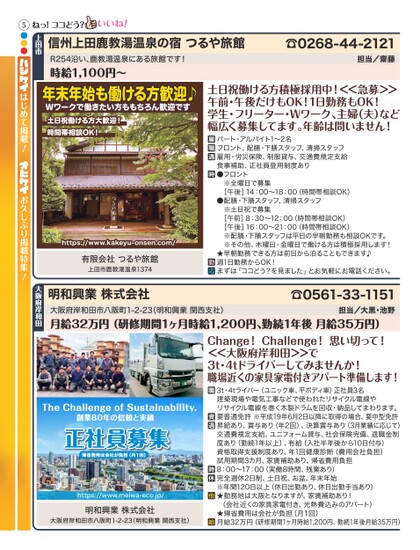 ☎0268-44-2121担当/齋藤信州上田鹿教湯温泉の宿つるや旅館R254沿い、鹿教湯温泉にある旅館です!時給1,100円〜上田市ねっ!ココどう?5●●●年末年始働ける方歓迎♪も働け方歓迎♪Wワークで働きたい方ももちろん歓迎です土日祝働ける方大歓迎!時間帯相談OK!https://www.kakeyu-onsen.com/有限会社つるや旅館上田市鹿教湯温泉1374土日祝働ける方積極採用中!<<急募>>午前・午後だけもOK!1日勤務もOK!学生・フリーター・Wワーク、主婦(夫)など幅広く募集してます。年齢は問いません!パート・アルバイト1〜2名フロント、配膳・下膳スタッフ、清掃スタッフ雇用・労災保険、制服貸与、交通費規定支給食事補助、正社員登用制度あり●フロント※全曜日で募集[午後]14:00〜18:00(時間帯相談OK)●配膳・下膳スタッフ、清掃スタッフ※土日祝で募集[午前]8:30〜12:00(時間帯相談OK)[午後]16:00〜21:00(時間帯相談OK)※配膳・下膳スタッフは平日の早朝勤務も相談OKです。※その他、木曜日・金曜日で働ける方は積極採用します!★早朝勤務できる方は前日から泊ることもできます♪週1日勤務からOK!まずは「ココどう?を見ました」とお気軽にお電話ください。はじめて掲載!お久しぶり掲載特集!大阪府岸和田市八阪町1-2-23(明和興業関西支社)月給32万円(研修期間1ヶ月時給1,200円、勤続1年後月給35万円)Change!Challenge!思い切って!<<大阪府岸和田>>で3t・4tドライバーしてみませんか!職場近くの家具家電付きアパート準備します!担当/大黒・池野TheChallengeofSustainability.創業80年の信頼と実績正社員募集帰省費用は会社が負担(月1回)https://www.meiwa-eco.jp/明和興業株式会社大阪府岸和田市八阪町1-2-23(明和興業関西支社)3t・4tライバー(ユニック車、平ボディ車)正社員3名建築現場や電気工事などで使われたリサイクル電線やリサイクル電線を巻く木製ドラムを回収・納品してまわります。要普通免許※平成19年6月2日以降に取得の場合、要中型免許昇給あり、賞与あり(年2回)、決算賞与あり(3月業績に応じて)交通費規定支給、ユニフォーム貸与、社会保険完備、退職金制度あり(勤続1年以上)、有給(入社半年後から10日付与)資格取得支援制度あり、年1回健康診断(費用会社負担)試用期間3カ月、家賃補助あり、帰省費用負担8:00〜17:00(実働8時間、残業あり)完全週休2日制、土日祝、お盆、年末年始※年間120日以上(休日出勤あり、休日出勤手当あり)★勤務地は大阪となりますが、家賃補助あり!(会社近くの家具家電付き、光熱費込みのアパート)★帰省費用は会社が負担(月1回)月給32万円(研修期間1ヶ月時給1,200円、勤続1年後月給35万円)☎0561-33-1151明和興業株式会社大阪府岸和田