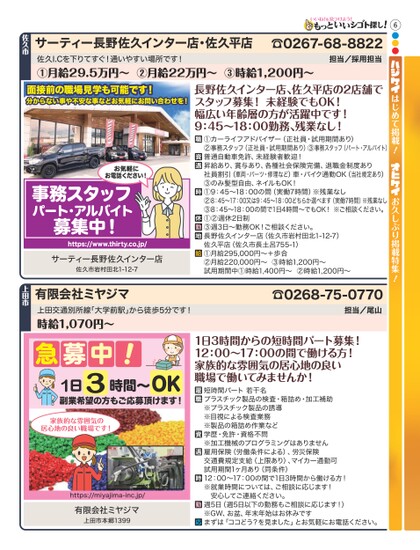 6●●●はじめて掲載お久しぶり掲載特集!佐久I.Cを下りてすぐ!通いやすい場所です!①月給29.5万円〜②月給22万円〜③時給1,200円〜担当/採用担当☎0267-68-8822サーティー長野佐久インター店・佐久平店佐久市面接前の職場見学も可能です!分からない事や不安な事などお気軽にお問い合わせを!長野佐久インター店、佐久平店の2店舗でスタッフ募集!未経験でもOK!幅広い年齢層の方が活躍中です!9:45〜18:00勤務、残業なし!①カーライフアドバイザー(正社員・試用期間あり)②事務スタッフ(正社員・試用期間あり)③事務スタッフ(パート・アルバイト)普通自動車免許、未経験者歓迎!昇給あり、賞与あり、各種社会保険完備、退職金制度あり社員割引(車両・パーツ・修理など)車・バイク通勤OK(当社規定あり)③のみ髪型自由、ネイルもOK!①9:45〜18:00の間(実働7時間)※残業なし②8:45〜17:00又は9:45〜18:00どちらか選べます(実働7時間)※残業なし③8:45〜18:00の間で1日4時間〜でもOK!※ご相談ください。①②週休2日制③週3日〜勤務OK!ご相談ください。長野佐久インター店(佐久市岩村田北1-12-7)佐久平店(佐久市長土呂755-1)①月給295,000円〜+歩合②月給220,000円〜③時給1,200円〜試用期間中①時給1,400円〜②時給1,200円〜!☎0268-75-0770担当/尾山1日3時間からの短時間パート募集!12:00〜17:00の間で働ける方!家族的な雰囲気の居心地の良い職場で働いてみませんか!短時間パート若干名プラスチック製品の検査・箱詰め・加工補助※プラスチック製品の誘導※目視による検査業務※製品の箱詰め作業など学歴・免許・資格不問※加工機械のプログラミングはありません雇用保険(労働条件による)、労災保険交通費規定支給(上限あり)、マイカー通勤可試用期間1ヶ月あり(同条件)12:00〜17:00の間で1日3時間から働ける方!※就業時間については、ご相談に応じます!安心してご連絡ください。週5日(週5日以下の勤務もご相談に応じます!)※GW、お盆、年末年始はお休みですまずは「ココどう?を見ました」とお気軽にお電話ください。サーティー長野佐久インター店佐久市岩村田北1-12-7有限会社ミヤジマ上田交通別所線「大学前駅」から徒歩5分です!時給1,070円〜上田市急募中!1日3時間〜OK副業希望の方もご応募頂けます!家族的な雰囲気の居心地の良い職場です!https://miyajima-inc.jp/有限会社ミヤジマ上田市本郷1399お気軽にお電話ください!事務スタッフパート・アルバイト募集中!https://www.thirty.co.jp/