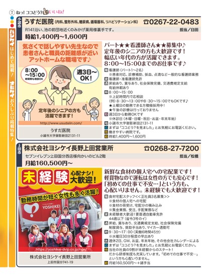 8:00〜15:00時間帯も相談OK週3日〜OK!定年後のシニアの方も活躍できます!http://www.usudaiin.com/うすだ医院小諸市大字御影新田2131-11パート★★看護師さん★★募集中♪定年後のシニアの方も大歓迎です!幅広い年代の方が活躍できます。8:00〜15:00までのお仕事です♪看護師(パート1〜2名)※患者対応、診療補助、採血、点滴など一般的な看護師業務看護師・准看護師免許昇給あり、賞与あり、社会保険完備、交通費規定支給有給休暇あり8:00〜15:00※上記時間内で応相談(例)8:30〜13:00や8:30〜15:00でもOKです♪★土曜日の勤務できる方積極採用中!★午後の診療は行っておりません週3日から勤務OKです※休診日(木曜・日曜・祝日・お盆・年末年始)小諸市大字御影新田2131-11まずは「ココどう?を見ました」とお気軽にお電話ください。働きやすい病院です。時給1,400円〜1,600円☎0268-27-7200担当/松橋株式会社ヨシケイ長野上田営業所セブンイレブン上田国分西店様向かいのビル2階月給160,500円〜上田市心配ナシ!未経験勤務時間が短く女性も多く活躍!大歓迎!https://yoshikei-dvlp.co.jp/ngn/株式会社ヨシケイ長野上田営業所上田市国分741-19新鮮な食材の個人宅への宅配業です!軽貨物なので運転は女性の方でも安心です!「初めての仕事で不安…」という方も、心配いりません。未経験でも大歓迎です!食材宅配スタッフ<<正社員3名募集>>※食材の個人宅への宅配※食材の荷受け、宅配分の積み込み※集金業務、受注、手配業務など未経験者大歓迎!要普通自動車免許44歳以下(省令3号のイ)昇給、賞与あり、交通費規定支給、社会保険完備制服貸与、奨励手当あり、マイカー通勤可9:30〜17:00(実働6時間45分)※水曜日30分程度の早出あり週休2日、GW、お盆、年末年始、その他会社カレンダーによるまずは「ココどう?を見ました」とお気軽にお電話ください。当社の社員の9割が未経験からのスタート!だから研修制度も充実しています。「初めての仕事で不安…」という方も心配いりません。月給160,500円〜+諸手当(内科、整形外科、糖尿病、循環器科、リハビリテーション科)☎0267-22-0483担当/臼田R141沿い、池の前団地近くのみかげ薬局様裏手です。時給1,400円〜1,600円気さくで話しやすい先生なので患者さんと職員の距離感が近いアットホームな職場です♪うすだ医院小諸市ねっ!ココどう?7●●●はじめて掲載!お久しぶり掲載特集!
