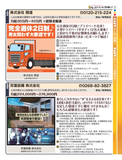 8●●●はじめて掲載!お久しぶり掲載特集!☎0120-215-224担当/採用担当しなの鉄道大屋駅から車で6分。上田市立塩川小学校を越えてすぐです。月給30万円〜40万円※経験者優遇完全週休2日制♪男女問わず大歓迎です!完全週休2日制♪プライベード充実!大型ドライバー(平ボディ)2名大募集!上田から千葉の定期便をお願いします♪高速道路使用!決まったルートで輸送!大型(平ボディ)https://www.kai-dou.com/株式会社開道上田市塩川919-1正社員2名大型ドライバー(平ボディ)大型免許※フォークリフト免許あれば尚可各種社会保険完備、昇給あり、家族手当各種資格手当あり(月5,000円〜10,000円)資格取得支援制度あり、退職金共済、社員旅行など運行スケジュールによる※実働8時間上田から千葉の定期便をお願いします♪高速道路を使用して決まったルートで輸送します!完全週休2日制年末年始、お盆、その他会社カレンダーによる※年間休日105日以上まずは「ココどう?を見ました」とお気軽にお電話ください。研修や先輩社員のサポートもあるので、安心して働けます。月給300,000円〜400,000円(経験者優遇)株式会社開道上田市暮らしに欠かせない“水”を支えるお仕事です!未経験大歓迎!先輩がしっかりサポートするので安心!安定した環境で手に職をつけませんか♪もちろん経験者も大歓迎です!設備工事の現場作業スタッフ(正社員1名)未経験者歓迎、高卒以上の方、普通自動車免許※住宅建設工事、建設業関連経験者歓迎昇給年1回、賞与年2回、各種社会保険完備、交通費規定支給資格取得支援制度、退職金制度あり、制服貸与諸手当(昼食手当、家族手当)8:00〜17:30(休憩120分)週休2日制、日曜、祝日、年末年始、GW、夏季、年間休日105日まずは「ココどう?を見ました」とお気軽にお電話ください。メールからの応募もOK!recruit@futaba-setsubi.co.jp浄水場などでの機械設備工事、一般住宅の設備工事、水まわりのリノベーションのお仕事です。月給224,000円〜376,900円※固定残業代(19,000円〜31,900円)を含みます。12時間を超える時間外労働は別途支給いたします。最初はみんな未経験でした!未経験者大歓迎!https://futaba-setsubi.co.jp/双葉設備株式会社坂城町大字上平2377-68☎0268-82-3827担当/採用担当上田方面から上田坂城バイパス「小網」信号を左折し、約1分くらいのところです。月給224,000円〜376,900円双葉設備株式会社坂城町
