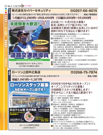 ☎0267-66-6015株式会社セイバーセキュリティ佐久市ねっ!ココどう?11●●●ローソン佐久横和店様カドの「横和」信号を佐久市街地から右折して車で1分です!①月給213,280円〜258,000円②日給9,920円〜12,000円担当/採用担当正社員・パート各10名大募集!松本・長野とエリア拡大中につき未経験者大歓迎!研修も充実しているので初めての方でも安心して働けます!交通誘導警備業務(雑踏警備はイベントの時のみ)※①正社員10名②パート10名未経験者OK!シニア・Wワークの方もOK!18歳以上(法令による)、交通誘導2級以上資格者優遇昇給あり、交通費規定支給、制服貸与、育児休業あり①社会保険完備、退職金制度あり、資格手当、精勤手当、遠方手当、出張手当、選任者手当、車輌補助手当、業務災害総合保険日焼け止め支給、熱中症対策(ドリンク支給・空調ベスト貸与)慶弔休暇、慶弔費、退職金積立②労働保険あり8:00〜17:00(実働8時間)①週休2日制(シフト制)週休3日でもOK!※その他会社カレンダー②週2〜3日勤務からOK!※週5日勤務できる方歓迎!※土日のみ勤務できる方歓迎!東信・北信・中信エリア①月給213,280円〜258,000円②日給9,920円〜12,000円※①②試用期間は時給1,061円未経験者大歓迎!正社員10名パート10名募集中!シニアの方も活躍中です!道路交通誘導員https://www.saber-security.com/株式会社セイバーセキュリティ佐久市根々井字屋敷563番地1はじめて掲載!お久しぶり掲載特集!☎0268-75-7874担当/店長ローソン上田中之条店ダイレックス中之条店様の目の前「中之条」の信号の角です時給1,061円〜1,327円上田市ローソンスタッフ募集NEWオープン店です!2026年1月中旬にNEWオープン!オープニングスタッフ大募集!全時間帯でスタッフを募集します♪学生からシニアまで幅広く歓迎です!貝出汁らぁ麺信州潮風オープニングスタッフ同時募集中!からあげ金と銀うえだ中塩田店上田市本郷634-2プラザビルパートⅡ1Fお問い合わせは070-1058-8887(担当:店長)ローソン上田中之条店上田市中之条565-1パート・アルバイト(大募集!)レジ・接客・商品管理・清掃・調理等フリーター大歓迎!たくさん働きたい方大歓迎!Wワークも、もちろんOK!昇給あり、制服貸与、研修あり、車通勤OK国内・海外旅行宿泊補助、健康診断人間ドック半額補助、スポーツ施設利用補助レンタカー20%割引、通信教育・資格取得でお祝い金、保育所・託児所の補助金制度あり24時間の中で全時間帯で募集中です!★1日3時間〜勤務OK!★ご希望の時間帯をお伝え下さい。週2〜3日勤務でOK!まずは「ココどう?を見ました」とお気軽にお電話下さい。※オープン前の為ローソン上田常磐城三丁目店で受付ます。5:00〜22:00は時給1,061円〜22:00〜翌5:00は時給1,327円〜
