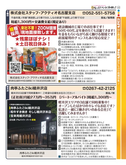 12●●●はじめて掲載!お久しぶり掲載特集!千曲市篠ノ井線「姨捨駅」より車で9分、しなの鉄道「千曲駅」より車で10分時給1,300円+交通費支給(規定あり)担当/採用係☎052-551-5758株式会社スタッフ・アクティオ名古屋支店千曲市建設機械の工場でのお仕事です!50代・60代、定年後の方でも活躍できます!年金をもらいながら長く働ける環境です!直接雇用のチャンスもあり安心安定♪派遣社員10名建設機械の点検・整備(未経験OK!)※小型機械もある為、女性活躍中です!※以下の資格があれば優遇フォークリフト免許、床上操作式クレーン技能者、玉掛け技能者社会保険完備、交通費別途支給(ガソリン代規定支給)制服貸与(つなぎ、安全靴、防寒着等全て貸与です)8:30〜17:30(実働8時間、休憩1時間)完全週休2日制※土・日・祝日、年末年始、GW、夏季休暇千曲市まずは「ココどう?」を見ました!とお気軽にお電話下さい!※来社不要!ZOOM面接、現地面接致します。(派遣業)派13-010578(有料職業紹介業)13-ユ-010834時給1,300円+交通費支給(規定あり)来社不要!ZOOM面接現地面接致します。残業ほぼナシ!★土日祝日休み!用★極積採https://www.staffaktio.co.jp/株式会社スタッフ・アクティオ名古屋支店愛知県名古屋市中村区名駅南2-14-19住友生命名古屋ビル8F[正社員]月給27万円〜35万円[パート・アルバイト]時給1,300円〜ご希望の店舗をお伝えください。肉亭ふたごiki軽井沢店和牛すき焼きそしじ軽井沢本店宝来苑軽井沢店正社員・アルバイト・パート募集https://www.nikutei25.com/karuizawa肉亭ふたごiki軽井沢店軽井沢町軽井沢1057-50軽井沢エリアの3店舗で同時募集中!オープンしたばかりのキレイなお店です♪私達と一緒に「働きがいのある会社」で活躍してみませんか!①正社員②パート・アルバイト(大募集!)ホール・キッチンスタッフ未経験でOK!資格やスキルも必要ありません♪①昇給・賞与、社会保険完備、制服貸与、まかない無料慶弔金制度、髪色・髪型自由(規定あり)、社員割引あり社員表彰制度(賞金50〜10万+副賞)、資格取得費用補助社員寮あり(家賃の半額補助※規定あり)②昇給あり、交通費規定支給(電車・車)、まかない無料制服貸与、社会保険完備①1日8時間のシフト制(店舗によって時間変動あり)②1日2時間〜勤務OK、たくさん働きたい方もOK!①月8日以上(シフト制)②週1日〜勤務OKです!肉亭ふたごiki軽井沢店(軽井沢町軽井沢1057ー50)和牛すき焼きそしじ軽井沢本店(軽井沢町軽井沢628)宝来苑軽井沢店(軽井沢町軽井沢552-2)まずは「ココどう?を見ました」とお気軽にお電話ください。☎0267-42-2125担当/林軽井沢の3店舗で同時募集中!ご希望の店舗をお伝えください!肉亭ふたごiki軽井沢店軽井沢