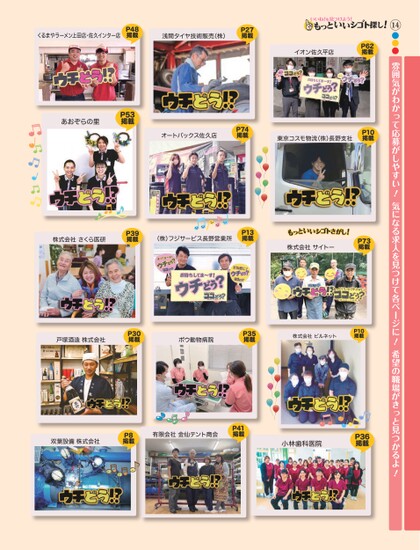 14●●●雰囲気がわかって応募がしやすい!気になる求人を見つけて各ページに!希望の職場がきっと見つかるよ!くるまやラーメン上田店・佐久インター店P48掲載浅間タイヤ技術販売(株)P27掲載イオン佐久平店P62掲載あおぞらの里P53掲載オートバックス佐久店P74掲載東京コスモ物流(株)長野支社P10掲載株式会社さくら医研P39掲載(株)フジサービス長野営業所P13掲載株式会社サイトーP73掲載戸塚酒造株式会社P30掲載ポウ動物病院P35掲載株式会社ビルネットP10掲載双葉設備株式会社P8掲載有限会社金仙テント商会P41掲載小林歯科医院P36掲載