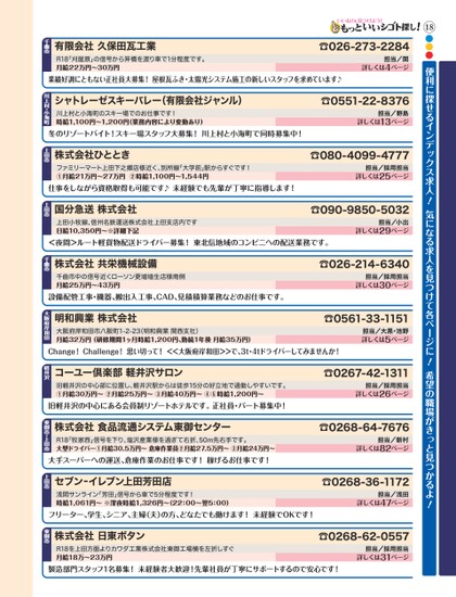 18●●●便利に探せるインデックス求人!気になる求人を見つけて各ページに!希望の職場がきっと見つかるよ!☎026-273-2284担当/関詳しくは4ページ有限会社久保田瓦工業R18「刈屋原」の信号から笄橋を渡り車で1分程度です。月給22万円〜30万円千曲市業績好調にともない正社員大募集!屋根瓦ふき・太陽光システム施工の新しいスタッフを求めています♪☎0551-22-8376担当/野島詳しくは13ページ冬のリゾートバイト!スキー場スタッフ大募集!川上村と小海町で同時募集中!シャトレーゼスキーバレー(有限会社ジャンル)川上村と小海町のスキー場でのお仕事です!時給1,100円〜1,200円(業務内容により変動あり)川上村・小海町☎080-4099-4777担当/採用担当詳しくは25ページ仕事をしながら資格取得も可能です♪未経験でも先輩が丁寧に指導します!株式会社ひとときファミリーマート上田下之郷店様近く、別所線「大学前」駅からすぐです!①月給21万円〜27万円②時給1,100円〜1,544円上田市☎090-9850-5032担当/小出詳しくは29ページ国分急送株式会社上田小牧線、信州名鉄運送株式会社上田支店内です日給10,350円〜※詳細下記上田市<夜間>ルート軽貨物配送ドライバー募集!東北信地域のコンビニへの配送業務です。☎026-214-6340担当/採用担当詳しくは30ページ☎0561-33-1151担当/大黒・池野詳しくは5ページ設備配管工事・機器、搬出入工事、CAD、見積積算業務などのお仕事です。明和興業株式会社大阪府岸和田市八阪町1-2-23(明和興業関西支社)月給32万円(研修期間1ヶ月時給1,200円、勤続1年後月給35万円)大阪府岸和田株式会社共栄機械設備千曲市中の信号近くローソン更埴埴生店様南側月給25万円〜43万円千曲市Change!Challenge!思い切って!<<大阪府岸和田>>で、3t・4tドライバーしてみませんか!☎0267-42-1311担当/採用担当詳しくは26ページ☎0268-64-7676担当/新村詳しくは82ページ☎0268-36-1172担当/浅田詳しくは47ページ☎0268-62-0557担当/採用担当詳しくは31ページコーユー倶楽部軽井沢サロン旧軽井沢の中心部に位置し、軽井沢駅からは徒歩15分の好立地で通勤しやすいです。①月給30万円〜②月給25万円〜③月給40万円〜④⑤時給1,200円〜軽井沢旧軽井沢の中心にある会員制リゾートホテルです。正社員・パート募集中!株式会社食品流通システム東御センターR18「牧家西」信号を下り、塩沢産業様を過ぎて右折、50m先右手です。大型ドライバー①月給30.5万円〜倉庫作業員②月給27.5万円〜③月給24万円〜東御市・上田市大手スーパーへの運送、倉庫作業のお仕事です!稼げるお仕事です!フリーター、学生、シニア、主婦(夫)の方、どなたでも働けます!未経験でOKです!セブン‐イレブン上田芳田店浅間サンライン「芳田」信号から車で5分程度です!時給1,061円〜※深夜時給1,326円〜(22:00〜翌5:00)上田市株式会社日東ボタンR18を上田方面よりカワダ工業株式会社東御工場横を左折しすぐ月給18万〜23万円東御市製造部門スタッフ1名募集!未経験者大歓迎!先輩社員が丁寧にサポートするので安心です!