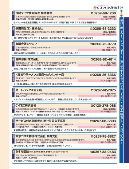 20●●●便利に探せるインデックス求人!気になる求人を見つけて各ページに!希望の職場がきっと見つかるよ!☎0267-68-1200担当/採用担当詳しくは27ページ浅間タイヤ技術販売株式会社イオンモール佐久平店様より浅科方面へ約1km、新幹線高架橋下です!月給23万円〜28万円※経験により優遇します。佐久市軽トラックから産業建設機械まで、タイヤのスペシャリスト集団で働きませんか?未経験者積極採用中!☎0268-68-2232担当/採用担当詳しくは2ページ依田川生コン株式会社R152「依田窪病院入口」信号をR254に入り、車で5分程度です!月給22万円〜25万円長和町16:40が定時でプライベートも充実!未経験でも丁寧に教えますのでご安心ください!☎0268-75-0770担当/尾山詳しくは6ページ☎0268-62-4614担当/石田詳しくは58ページ☎0268-25-6366担当/坂田詳しくは48ページ☎0267-62-7875担当/芹沢詳しくは74ページ1日3時間からの短時間パート募集!12:00〜17:00の間で働ける方!有限会社ミヤジマ上田交通別所線「大学前駅」から徒歩5分です!時給1,070円〜上田市東部湯の丸インター近く!浅間サンライン「中央公園入口」信号からスグです!【経験者】月給25万円〜33万円【未経験者】月給22万円〜28万円溶接工・仕上げスタッフ大募集!★年齢問わず大歓迎です♪金井溶接株式会社東御市くるまやラーメン上田店・佐久インター店[佐久]佐久I.Cを下りてすぐ近くです![上田]イオンスタイル上田店様すぐ近く時給1,200円〜上田市・佐久市土・日・祝・連休など働ける方大歓迎です!積極採用いたします♪オートバックス佐久店BOOKOFF佐久中込店様近く、ツルヤ佐久中央店様目の前です!時給1,200円〜佐久市☎0120-278-088担当/採用担当詳しくはH2ページANAホリデイ・インリゾート軽井沢新規オープニングスタッフ大募集!未経験者歓迎!C-TEC株式会社大自然に囲まれた北軽井沢「ANAホリデイ・インリゾート軽井沢」でのお仕事です!時給1,300円〜※マイカー通勤できる方ガソリン手当1日1,000円支給北軽井沢☎0267-68-8803担当/土屋詳しくは39ページサービス付き高齢者向け住宅佐久平高原佐久平駅から車で12分!裏道でサクサク来れるので、市内より通勤ラクラク!①月給18.7万円〜②時給1,065円〜※①②+各種手当佐久市未経験者歓迎!資格取得補助もあります!お子様がいる方でも安心して働ける環境です!アルバイト→契約社員→正社員とステップUP!整備士資格を取りたい方大歓迎です♪☎0267-78-3827担当/高橋詳しくは10ページ☎0267-22-0483担当/臼田詳しくは7ページ佐久市役所近く、R138「中込中央区」の信号からすぐ、BOOKOFF佐久中込店様の裏です。[4t]月給25万円〜33万円[大型]月給28万円〜40万円東京コスモ物流株式会社長野支社佐久市4t・大型車ウイング車の運転業務!定期のお仕事がメインです。定年後のシニアの方も大歓迎です!幅広い年代の方が活躍できます。(内科、整形外科、糖尿病、循環器科、リハビリテーション科)うすだ医院小諸市R141沿い、池の前団地近くのみかげ薬局様裏手です。時給1,400円〜1,600円