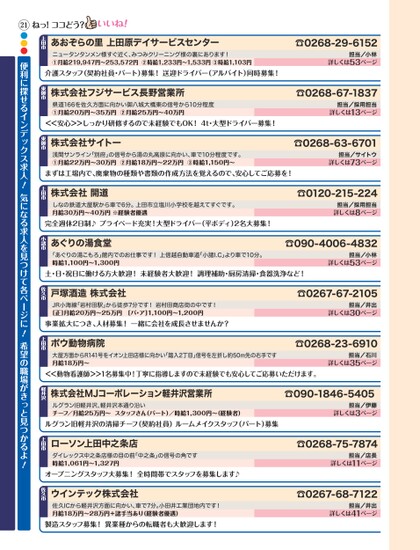 ☎0268-29-6152担当/小林詳しくは53ページ介護スタッフ(契約社員・パート)募集!送迎ドライバー(アルバイト)同時募集!あおぞらの里上田原デイサービスセンターニュータンタンメン様すぐ近く、みつみクリーニング様の裏にあります!①月給219,947円〜253,572円②時給1,233円〜1,533円③時給1,103円上田市☎0268-67-1837担当/採用担当詳しくは13ページ☎0268-63-6701担当/サイトウ詳しくは73ページ☎0120-215-224担当/採用担当詳しくは8ページまずは工場内で、廃棄物の種類や書類の作成方法を覚えるので、安心してご応募を!株式会社サイトー浅間サンライン「別府」の信号から湯の丸高原に向かい、車で10分程度です。①月給22万円〜30万円②月給18万円〜22万円③時給1,150円〜東御市<<安心>>しっかり研修するので未経験でもOK!4t・大型ドライバー募集!株式会社フジサービス長野営業所県道166を佐久方面に向かい御八城大橋東の信号から10分程度①月給20万円〜35万円②月給25万円〜40万円東御市完全週休2日制♪プライベード充実!大型ドライバー(平ボディ)2名大募集!株式会社開道しなの鉄道大屋駅から車で6分。上田市立塩川小学校を越えてすぐです。月給30万円〜40万円※経験者優遇上田市ねっ!ココどう?☎090-4006-4832担当/小林詳しくは53ページ「あぐりの湯こもろ」館内でのお仕事です!上信越自動車道「小諸I.C」より車で10分。時給1,100円〜1,300円あぐりの湯食堂小諸市☎0267-67-2105担当/井出詳しくは30ページ☎0268-23-6910担当/石川詳しくは35ページポウ動物病院大屋方面からR141号をイオン上田店様に向かい「踏入2丁目」信号を左折し約50m先の右手です月給18万円〜上田市事業拡大につき、人材募集!一緒に会社を成長させませんか?戸塚酒造株式会社JR小海線「岩村田駅」から徒歩7分です!岩村田商店街の中です![正]月給20万円〜25万円[パ・ア]1,100円〜1,200円佐久市☎090-1846-5405担当/伊藤詳しくは3ページ株式会社MJコーポレーション軽井沢営業所ルグラン旧軽井沢、軽井沢本通り沿いチーフ/月給25万円〜スタッフさん(パート)/時給1,300円〜(経験者)軽井沢ルグラン旧軽井沢の清掃チーフ(契約社員)ルームメイクスタッフ(パート)募集<<動物看護師>>1名募集中!丁寧に指導しますので未経験でも安心してご応募いただけます。☎0268-75-7874担当/店長詳しくは11ページ☎0267-68-7122担当/井出詳しくは41ページオープニングスタッフ大募集!全時間帯でスタッフを募集します♪ローソン上田中之条店ダイレックス中之条店様の目の前「中之条」の信号の角です時給1,061円〜1,327円上田市ウインテック株式会社佐久ICから軽井沢方面に向かい、車で7分。小田井工業団地内です!月給18万円〜28万円+諸手当あり(経験者優遇)佐久市製造スタッフ募集!異業種からの転職者も大歓迎します!土・日・祝日に働ける方大歓迎!未経験者大歓迎!調理補助・厨房清掃・食器洗浄など!21●●●便利に探せるインデックス求人!気になる求人を見つけて各ページに!希望の職場がきっと見つかるよ!
