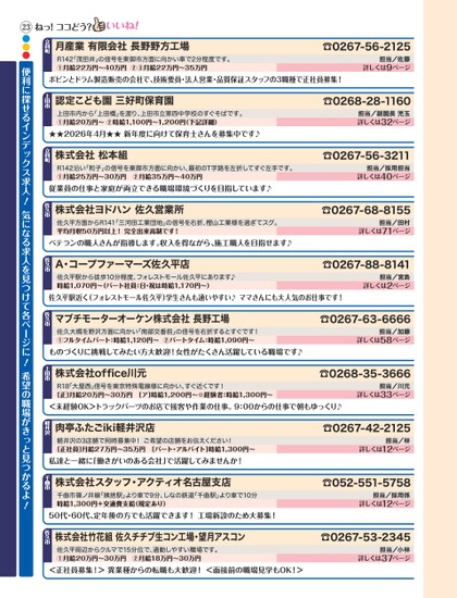 ☎0267-56-2125担当/佐藤詳しくは9ページ月産業有限会社長野野方工場R142「茂田井」の信号を東御市方面に向かい車で2分程度です。①月給22万円〜40万円②③月給22万円〜35万円立科町ねっ!ココどう?☎0268-28-1160担当/副園長児玉詳しくは32ページ☎0267-56-3211担当/採用担当詳しくは40ページ☎0267-68-8155担当/田村詳しくは71ページ☎0267-88-8141担当/宮島詳しくは2ページ株式会社松本組R142沿い「和子」の信号を東御市方面に向かい、最初のT字路を左折してすぐ左手です。①月給25万円〜30万円②月給35万円〜40万円立科町ベテランの職人さんが指導します。収入を得ながら、施工職人を目指せます♪株式会社ヨドハン佐久営業所佐久平方面からR141「三河田工業団地」の信号を右折、樫山工業様を過ぎてスグ。平均月収50万円以上!完全出来高制です!佐久市従業員の仕事と家庭が両立できる職場環境づくりを目指しています♪★★2026年4月★★新年度に向けて保育士さんを募集中です♪認定こども園三好町保育園上田市内から「上田橋」を渡り、上田市立第四中学校のすぐそばです。①月給20万円〜②時給1,100円〜1,200円(下記詳細)上田市A・コープファーマーズ佐久平店佐久平駅から徒歩10分程度、フォレストモール佐久平にあります♪時給1,070円〜(パート社員:日・祝は時給1,170円〜)佐久市佐久平駅近く(フォレストモール佐久平)学生さんも通いやすい♪ママさんにも大人気のお仕事です!ボビンとドラム製造販売の会社で、技術要員・法人営業・品質保証スタッフの3職種で正社員募集!☎0267-63-6666担当/加藤詳しくは58ページ☎0268-35-3666担当/川元詳しくは33ページものづくりに挑戦してみたい方大歓迎!女性がたくさん活躍している職場です♪マブチモーターオーケン株式会社長野工場佐久大橋を野沢方面に向かい「南部交番前」の信号を右折するとすぐです!①フルタイムパート:時給1,120円〜②パートタイム:時給1,090円〜佐久市R18「大屋西」信号を東京特殊電線様に向かい、すぐ近くです![正]月給20万円〜30万円[ア]時給1,200円〜※経験者:時給1,300円〜株式会社office川元上田市☎0267-42-2125担当/林詳しくは12ページ☎052-551-5758担当/採用係詳しくは12ページ☎0267-53-2345担当/小林詳しくは37ページ<正社員募集!>異業種からの転職も大歓迎!<面接前の職場見学もOK!>株式会社竹花組佐久チチブ生コン工場・望月アスコン佐久平周辺からクルマで15分位で、通勤しやすい職場です。①月給20万円〜30万円②月給18万円〜30万円佐久市50代・60代、定年後の方でも活躍できます!工場新設のため大募集!株式会社スタッフ・アクティオ名古屋支店千曲市篠ノ井線「姨捨駅」より車で9分、しなの鉄道「千曲駅」より車で10分時給1,300円+交通費支給(規定あり)千曲市私達と一緒に「働きがいのある会社」で活躍してみませんか!肉亭ふたごiki軽井沢店軽井沢の3店舗で同時募集中!ご希望の店舗をお伝えください![正社員]月給27万円〜35万円[パート・アルバイト]時給1,300円〜軽井沢<未経験OK>トラックパーツのお店で接客や作業の仕事。9:00からの仕事で朝もゆっくり♪23●●●便利に探せるインデックス求人!気になる求人を見つけて各ページに!希望の職場がきっと見つかるよ!