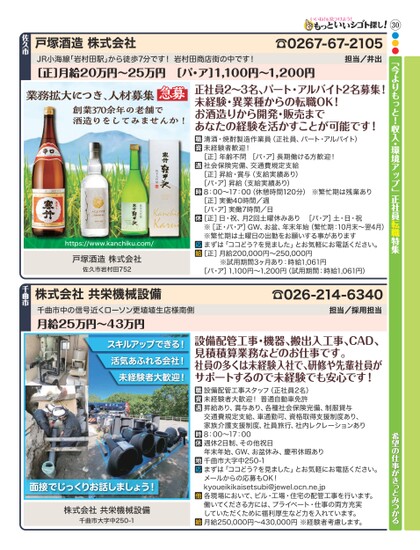 30●●●「今よりもっと!収入・環境アップ」正社員転職特集☎0267-67-2105担当/井出JR小海線「岩村田駅」から徒歩7分です!岩村田商店街の中です![正]月給20万円〜25万円[パ・ア]1,100円〜1,200円戸塚酒造株式会社佐久市業務拡大につき、人材募集急募創業370余年の老舗で酒造りをしてみませんか!正社員2〜3名、パート・アルバイト2名募集!未経験・異業種からの転職OK!お酒造りから開発・販売まであなたの経験を活かすことが可能です!清酒・焼酎製造作業員(正社員、パート・アルバイト)未経験者歓迎![正]年齢不問[パ・ア]長期働ける方歓迎!社会保険完備、交通費規定支給[正]昇給・賞与(支給実績あり)[パ・ア]昇給(支給実績あり)8:00〜17:00(休憩時間120分)※繁忙期は残業あり[正]実働40時間/週[パ・ア]実働7時間/日[正]日・祝、月2回土曜休みあり[パ・ア]土・日・祝※[正・パ・ア]GW、お盆、年末年始(繁忙期:10月末〜翌4月)※繁忙期は土曜日の出勤をお願いする事がありますまずは「ココどう?を見ました」とお気軽にお電話ください。[正]月給200,000円〜250,000円※試用期間3ヶ月あり:時給1,061円[パ・ア]1,100円〜1,200円(試用期間:時給1,061円)☎026-214-6340担当/採用担当https://www.kanchiku.com/戸塚酒造株式会社佐久市岩村田752株式会社共栄機械設備千曲市中の信号近くローソン更埴埴生店様南側月給25万円〜43万円千曲市スキルアップできる!活気あふれる会社!未経験者大歓迎!設備配管工事・機器、搬出入工事、CAD、見積積算業務などのお仕事です。社員の多くは未経験入社で、研修や先輩社員がサポートするので未経験でも安心です!希望の仕事がきっとみつかる設備配管工事スタッフ(正社員2名)未経験者大歓迎!普通自動車免許昇給あり、賞与あり、各種社会保険完備、制服貸与交通費規定支給、車通勤可、資格取得支援制度あり、家族介護支援制度、社員旅行、社内レクレーションあり8:00〜17:00週休2日制、その他祝日年末年始、GW、お盆休み、慶弔休暇あり千曲市大字中250-1まずは「ココどう?を見ました」とお気軽にお電話ください。メールからの応募もOK!kyoueikikaisetsubi@jewel.ocn.ne.jp各現場において、ビル・工場・住宅の配管工事を行います。働いてくださる方には、プライベート・仕事の両方充実していただくために福利厚生など力を入れています。月給250,000円〜430,000円※経験者考慮します。面接でじっくりお話しましょう!株式会社共栄機械設備千曲市大字中250-1