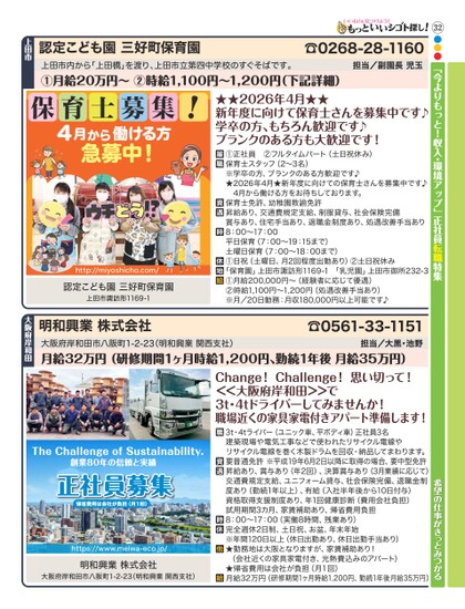 32●●●「今よりもっと!収入・環境アップ」正社員転職特集☎0268-28-1160担当/副園長児玉上田市内から「上田橋」を渡り、上田市立第四中学校のすぐそばです。①月給20万円〜②時給1,100円〜1,200円(下記詳細)保育士募集!4月から働ける方急募中!http://miyoshicho.com/認定こども園三好町保育園上田市諏訪形1169-1★★2026年4月★★新年度に向けて保育士さんを募集中です♪学卒の方、もちろん歓迎です♪ブランクのある方も大歓迎です!①正社員②フルタイムパート(土日祝休み)保育士スタッフ(2〜3名)※学卒の方、ブランクのある方歓迎です♪★2026年4月★新年度に向けての保育士さんを募集中です♪4月から働ける方をお待ちしております。保育士免許、幼稚園教諭免許昇給あり、交通費規定支給、制服貸与、社会保険完備賞与あり、住宅手当あり、退職金制度あり、処遇改善手当あり8:00〜17:00平日保育(7:00〜19:15まで)土曜日保育(7:00〜18:00まで)①日祝(土曜日、月2回程度出勤あり)②土日祝休み「保育園」上田市諏訪形1169-1「乳児園」上田市御所232-3①月給200,000円〜(経験者に応じて優遇)②時給1,100円〜1,200円(処遇改善手当あり)※月/20日勤務:月収180,000円以上可能です♪認定こども園三好町保育園上田市☎0561-33-1151大阪府岸和田市八阪町1-2-23(明和興業関西支社)月給32万円(研修期間1ヶ月時給1,200円、勤続1年後月給35万円)Change!Challenge!思い切って!<<大阪府岸和田>>で3t・4tドライバーしてみませんか!職場近くの家具家電付きアパート準備します!担当/大黒・池野希望の仕事がきっとみつかる3t・4tライバー(ユニック車、平ボディ車)正社員3名建築現場や電気工事などで使われたリサイクル電線やリサイクル電線を巻く木製ドラムを回収・納品してまわります。要普通免許※平成19年6月2日以降に取得の場合、要中型免許昇給あり、賞与あり(年2回)、決算賞与あり(3月業績に応じて)交通費規定支給、ユニフォーム貸与、社会保険完備、退職金制度あり(勤続1年以上)、有給(入社半年後から10日付与)資格取得支援制度あり、年1回健康診断(費用会社負担)試用期間3カ月、家賃補助あり、帰省費用負担8:00〜17:00(実働8時間、残業あり)完全週休2日制、土日祝、お盆、年末年始※年間120日以上(休日出勤あり、休日出勤手当あり)★勤務地は大阪となりますが、家賃補助あり!(会社近くの家具家電付き、光熱費込みのアパート)★帰省費用は会社が負担(月1回)月給32万円(研修期間1ヶ月時給1,200円、勤続1年後月給35万円)TheChallengeofSustainability.創業80年の信頼と実績正社員募集帰省費用は会社が負担(月1回)https://www.meiwa-eco.jp/明和興業株式会社大阪府岸和田市八阪町1-2-23(明和興業関西支社)明和興業株式会社大阪府岸和田