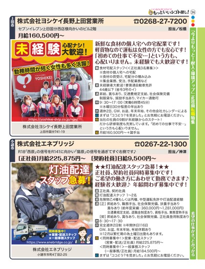34●●●「今よりもっと!収入・環境アップ」正社員転職特集希望の仕事がきっとみつかる☎0268-27-7200担当/松橋株式会社ヨシケイ長野上田営業所セブンイレブン上田国分西店様向かいのビル2階月給160,500円〜上田市心配ナシ!未経験勤務時間が短く女性も多く活躍!大歓迎!https://yoshikei-dvlp.co.jp/ngn/株式会社ヨシケイ長野上田営業所上田市国分741-19新鮮な食材の個人宅への宅配業です!軽貨物なので運転は女性の方でも安心です!「初めての仕事で不安…」という方も、心配いりません。未経験でも大歓迎です!食材宅配スタッフ<<正社員3名募集>>※食材の個人宅への宅配※食材の荷受け、宅配分の積み込み※集金業務、受注、手配業務など未経験者大歓迎!要普通自動車免許44歳以下(省令3号のイ)昇給、賞与あり、交通費規定支給、社会保険完備制服貸与、奨励手当あり、マイカー通勤可9:30〜17:00(実働6時間45分)※水曜日30分程度の早出あり週休2日、GW、お盆、年末年始、その他会社カレンダーによるまずは「ココどう?を見ました」とお気軽にお電話ください。当社の社員の9割が未経験からのスタート!だから研修制度も充実しています。「初めての仕事で不安…」という方も心配いりません。月給160,500円〜+諸手当☎0267-22-1300担当/神津R18「西原」の信号をR141に向かい「猫原」の信号を過ぎてすぐ右側です♪[正社員]月給225,875円〜[契約社員]日給9,500円〜株式会社エネブリッジ小諸市灯油配達スタッフ急募!★★灯油配達スタッフ急募!★★正社員、契約社員同時募集中です!ご希望の働き方にあわせて勤務できます♪経験者大歓迎♪年齢問わず募集中です!正社員、契約社員灯油配達スタッフ1〜2名危険物乙4種もしくは丙種、中型運転免許や灯油配達経験[正]昇給あり、職務手当、社会保険完備、扶養手当あり賞与あり(前年度実績:360,000円〜1,281,000円)交通費規定支給、退職金制度あり、資格手当、業務習熟手当[契]昇給あり、賞与あり、社会保険完備、正社員登用制度あり8:30〜17:30完全週休2日制※年間休日116日GW、お盆、年末年始、有給休暇あり※12月は繁忙期の為土曜日出勤もあります。<同時募集中!>営業・配送スタッフ(営業・配送/正社員)月給225,875円〜<同時募集中!>一般事務スタッフ(一般事務/正社員)月給184,500円〜まずは「ココどう?を見ました」とお気軽にお電話ください。同時募集中!★営業・配送スタッフ★一般事務スタッフhttps://www.enebridge.co.jp/株式会社エネブリッジ小諸市市町4丁目2-25