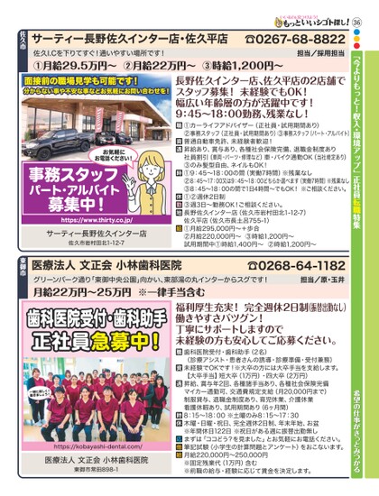 36●●●「今よりもっと!収入・環境アップ」正社員転職特集☎0267-68-8822担当/採用担当佐久I.Cを下りてすぐ!通いやすい場所です!①月給29.5万円〜②月給22万円〜③時給1,200円〜サーティー長野佐久インター店・佐久平店佐久市面接前の職場見学も可能です!分からない事や不安な事などお気軽にお問い合わせを!長野佐久インター店、佐久平店の2店舗でスタッフ募集!未経験でもOK!幅広い年齢層の方が活躍中です!9:45〜18:00勤務、残業なし!お気軽にお電話ください!事務スタッフパート・アルバイト募集中!https://www.thirty.co.jp/サーティー長野佐久インター店佐久市岩村田北1-12-7①カーライフアドバイザー(正社員・試用期間あり)②事務スタッフ(正社員・試用期間あり)③事務スタッフ(パート・アルバイト)普通自動車免許、未経験者歓迎!昇給あり、賞与あり、各種社会保険完備、退職金制度あり社員割引(車両・パーツ・修理など)車・バイク通勤OK(当社規定あり)③のみ髪型自由、ネイルもOK!①9:45〜18:00の間(実働7時間)※残業なし②8:45〜17:00又は9:45〜18:00どちらか選べます(実働7時間)※残業なし③8:45〜18:00の間で1日4時間〜でもOK!※ご相談ください。①②週休2日制③週3日〜勤務OK!ご相談ください。長野佐久インター店(佐久市岩村田北1-12-7)佐久平店(佐久市長土呂755-1)①月給295,000円〜+歩合②月給220,000円〜③時給1,200円〜試用期間中①時給1,400円〜②時給1,200円〜希望の仕事がきっとみつかる歯科医院受付・歯科助手(2名)(診療アシスト・患者さんの誘導・診療準備・受付兼務)未経験でOKです!※大卒の方には大卒手当を支給します。【大卒手当】短大卒(1万円)・四大卒(2万円)昇給、賞与年2回、各種諸手当あり、各種社会保険完備マイカー通勤可、交通費規定支給(月20,000円まで)制服貸与、退職金制度あり、育児休業、介護休業看護休暇あり、試用期間あり(6ヶ月間)8:15〜18:00※土曜のみ8:15〜17:30木曜・日曜・祝日、完全週休2日制、年末年始、お盆※年間休日122日※祝日がある週に振替出勤無しまずは「ココどう?を見ました」とお気軽にお電話ください。筆記試験(小学生の計算問題とアンケート)をおこないます。月給220,000円〜250,000円※固定残業代(1万円)含む※前職の給与・経験に応じて賃金を決定します。福利厚生充実!完全週休2日制(振替出勤なし)働きやすさバツグン!丁寧にサポートしますので未経験の方も安心してご応募ください。歯科医院受付・歯科助手正社員急募中!一緒に楽しく!働きましょう!https://kobayashi-dental.com/医療法人文正会小林歯科医院東御市常田898-1☎0268-64-1182担当/原・玉井グリーンパーク通り「東御中央公園」向かい、東部湯の丸インターからスグです!月給22万円〜25万円※一律手当含む医療法人文正会小林歯科医院東御市