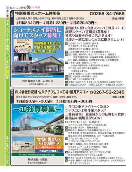 ☎0268-34-7689担当/橋詰上田市蒼久保の信号から車で1分。東京精電上田工場様の目の前!①月給25.1万円〜②時給1,230円〜③月給20.5万円〜特別養護老人ホーム神川苑上田市ねっ!ココどう?ショートステイ開所にショートステイ開所に向けてスタッフ募集!向けてスタッフ募集!有資格者はもちろん年齢や経験によって給与UPします!https://nodoka-hidamari.com/特別養護老人ホーム神川苑上田市蒼久保1181-6業務拡大に伴い、介護スタッフ(正職員・パート)調理スタッフ(正職員)募集中!資格や経験を存分に活かせます!私達と一緒に楽しく元気に働きましょう!①介護スタッフ(正職員)若干名②介護スタッフ(パート)若干名③調理スタッフ(正職員)若干名①②未経験でOKです!③経験者歓迎です![正]昇給、賞与あり、借上げアパートあり、制服貸与交通費規定支給、社会保険完備、退職金制度あり[パ]昇給、制服貸与、交通費規定支給、社会保険完備①早番・遅番・夜勤のシフト制※実働8時間勤務※週40時間(夜勤あり)②7:00〜20:00の中で4時間〜※夜勤ありません③早番・日勤のシフト制※実働8時間[正]4週8休※年間休日105日[パ]週2日から勤務OKです!まずは「ココどう?」を見ました!とお気軽にお電話下さい♪①月給251,000円〜②時給1,230円〜③月給205,000円〜ー正社員募集ー地域に根ざして★100周年★生コン車ドライバー<急募>作業スタッフ募集!https://www.takehanagumi.co.jp/株式会社竹花組本社/佐久市望月30-1①生コン車ドライバー<急募>②アスコン工場作業スタッフ正社員募集!異業種からの転職も大歓迎!面接前の職場見学もOK!①生コン車ドライバー(正社員1名)②アスコン工場作業スタッフ(正社員1名)未経験者でもOK!経験者優遇昇給あり、賞与あり(昨年実績年2回・2ヶ月分)交通費支給(上限24,000円)、社会保険完備、育児休業あり社員旅行、資格取得推奨制度、スポーツ施設利用①「生コン工場」7:40〜17:10②「アスコン工場」7:30〜17:00土曜日、日曜日、祝日、年末年始、GW、夏季※当社カレンダーによる(年間休日110日)※入社時より10日有給休暇付与佐久市塩名田1166-1(佐久チチブ生コン工場)佐久市望月1119(望月アスコン工場)まずは「ココどう?を見ました」とお気軽にお電話ください。※冬期、時間外で除雪・塩カルの仕事をやっていただける方は収入アップできます!佐久平周辺からクルマで15分位で、通勤しやすい職場です。①月給20万円〜30万円②月給18万円〜30万円担当/小林☎0267-53-2345株式会社竹花組佐久チチブ生コン工場・望月アスコン佐久市37●●●「今よりもっと!収入・環境アップ」正社員転職特集希望の仕事がきっとみつかる