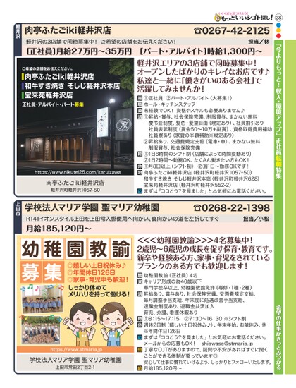 38●●●「今よりもっと!収入・環境アップ」正社員転職特集肉亭ふたごiki軽井沢店☎0267-42-2125担当/林軽井沢の3店舗で同時募集中!ご希望の店舗をお伝えください![正社員]月給27万円〜35万円[パート・アルバイト]時給1,300円〜ご希望の店舗をお伝えください。肉亭ふたごiki軽井沢店和牛すき焼きそしじ軽井沢本店宝来苑軽井沢店正社員・アルバイト・パート募集https://www.nikutei25.com/karuizawa肉亭ふたごiki軽井沢店軽井沢町軽井沢1057-50軽井沢エリアの3店舗で同時募集中!オープンしたばかりのキレイなお店です♪私達と一緒に「働きがいのある会社」で活躍してみませんか!①正社員②パート・アルバイト(大募集!)ホール・キッチンスタッフ未経験でOK!資格やスキルも必要ありません♪①昇給・賞与、社会保険完備、制服貸与、まかない無料慶弔金制度、髪色・髪型自由(規定あり)、社員割引あり社員表彰制度(賞金50〜10万+副賞)、資格取得費用補助社員寮あり(家賃の半額補助※規定あり)②昇給あり、交通費規定支給(電車・車)、まかない無料制服貸与、社会保険完備①1日8時間のシフト制(店舗によって時間変動あり)②1日2時間〜勤務OK、たくさん働きたい方もOK!①月8日以上(シフト制)②週1日〜勤務OKです!肉亭ふたごiki軽井沢店(軽井沢町軽井沢1057ー50)和牛すき焼きそしじ軽井沢本店(軽井沢町軽井沢628)宝来苑軽井沢店(軽井沢町軽井沢552-2)まずは「ココどう?を見ました」とお気軽にお電話ください。学校法人マリア学園聖マリア幼稚園R141イオンスタイル上田を上田常入郵便局へ向かい、真向かいの道を左折してすぐ月給185,120円〜☎0268-22-1398担当/小松希望の仕事がきっとみつかる幼稚園教諭(正社員)4名キャリア形成の為40歳以下専門学校卒以上、幼稚園教諭免許(専修・1種・2種)昇給あり、賞与あり、社会保険完備、交通費規定支給、毎月調整手当支給、年末度に処遇改善手当支給、退職金制度あり、退職金共済加入育児、介護、看護休暇あり①8:15〜17:15②7:30〜16:30※シフト制週休2日制(嬉しい土日祝休み♪)、年末年始、お盆休み、他※年間休日126日まずは「ココどう?を見ました」とお気軽にお電話ください。メールからの応募もOK!shiawase@stmaria.jp丁寧なOJTがありますので、疑問や不安があればすぐに聞くことができる体制が整っています◎安心して仕事に慣れていけるよう、しっかりとフォローいたします。月給185,120円〜<<<幼稚園教諭>>>4名募集中!2歳児〜6歳児の成長を促す保育・教育です。新卒や経験ある方、家事・育児をされているブランクのある方でも歓迎します!幼稚園教諭募集◎嬉しい土日祝休み♪◎年間休日126日◎家事・育児中も歓迎!しっかり休めてメリハリを持って働ける!https://www.stmaria.jp学校法人マリア学園聖マリア幼稚園上田市常田2丁目2-1軽井沢上田市
