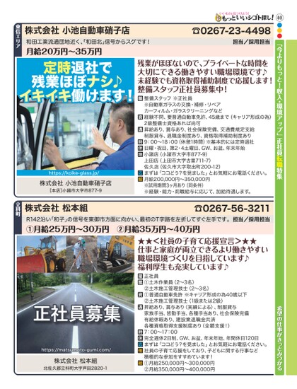 40●●●「今よりもっと!収入・環境アップ」正社員転職特集☎0267-23-4498担当/採用担当株式会社小池自動車硝子店和田工業流通団地近く、和田北」信号からスグです!月給20万円〜35万円東信エリア定時退社で残業ほぼナシ♪イキイキ働けます!https://koike-glass.jp/株式会社小池自動車硝子店[本店]小諸市大字市877-9残業がほぼないので、プライベートな時間を大切にできる働きやすい職場環境です♪未経験でも資格取得補助制度で応援します!整備スタッフ正社員募集中!整備スタッフ※正社員※自動車ガラスの交換・補修・リペアカーフィルム・ガラスクリーニングなど経験不問、要普通自動車免許、45歳まで(キャリア形成の為)2級整備士資格あれば尚可昇給あり、賞与あり、社会保険完備、交通費規定支給制服貸与、退職金制度あり、資格取得補助制度あり9:00〜18:00(休憩1時間)※基本的には定時退社日曜・祝日、第2・4土曜日、GW、お盆、年末年始小諸店(小諸市大字市877-9)上田店(上田市大字古里711-7)佐久店(佐久市大字取出町200-12)まずは「ココどう?を見ました」とお気軽にお電話ください。月給200,000円〜350,000円※試用期間3ヶ月あり(同条件)※経験・能力・前職給与に応じて、加給待遇します。希望の仕事がきっとみつかる★★<社員の子育て応援宣言>★★仕事と家庭が両立できるより働きやすい職場環境づくりを目指しています♪福利厚生も充実しています♪正社員①土木作業員(2〜3名)②土木施工管理技士(2〜3名)①普通自動車免許※キャリア形成の為40歳以下②土木施工管理技士(1級または2級)昇給あり、賞与あり(実績による)、制服貸与家族手当、皆勤手当、各種手当あり、社会保険完備有給休暇あり、建設業退職金共済各種資格取得支援制度あり(全額支援!)7:00〜17:00完全週休2日制、GW、お盆、年末年始、年間休日120日まずは「ココどう?を見ました」とお気軽にお電話ください。社員の子育て応援をしており、子どもに関する行事など積極的な参加をすすめています!①月給250,000円〜300,000円②月給350,000円〜400,000円正社員募集https://matsumoto-gumi.com/株式会社松本組北佐久郡立科町大字田2820-1R142沿い「和子」の信号を東御市方面に向かい、最初のT字路を左折してすぐ左手です。担当/採用担当①月給25万円〜30万円②月給35万円〜40万円☎0267-56-3211株式会社松本組立科町