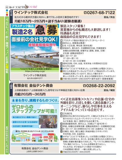 ☎0267-68-7122担当/井出製造スタッフ募集!異業種からの転職者も大歓迎します!待遇面も充実!面接前の会社見学もできます!プラスチック製品の製造スタッフ(オペレーター)高卒以上、経験者は優遇!2名※正社員、準社員(契約社員)昇給あり、賞与あり、交通費規定支給、作業服貸与各種社会保険完備、各種手当(資格、家族、交替)正社員:退職金制度あり8:30〜17:2017:00〜翌1:100:50〜9:30※3交替制週休2日制、GW、お盆、年末年始※年間休日122日佐久市小田井まずは「ココどう?を見ました」とお気軽にお電話ください。車から化粧品までいろんなプラスチック製品を作っています。待遇面も充実しているので、安心して働けます!新しい力を待っています。あなたの経験を活かしてみませんか!月給180,000円〜280,000円+諸手当あり(経験者優遇)佐久ICから軽井沢方面に向かい、車で7分。小田井工業団地内です!月給18万円〜28万円+諸手当あり(経験者優遇)ウインテック株式会社佐久市ねっ!ココどう?プラスチック製品急募製造2名面接前の会社見学OK!経験者積極採用中☎0268-22-2092担当/城田上田創造館近く「上田創造館入口」信号をツルヤ神畑店方面に向かい左側月給20万円〜30万円有限会社金仙テント商会上田市未来を作り、挑戦するものづくり。ゼロからのステップアップが可能!競合他社が少ない職種の強み!創業60年の企業で正社員雇用!会社負担で資格取得可能!暮らしや仕事を支えるアイテムをつくっている会社https://www.kinsentent.com/有限会社金仙テント商会上田市上田原1343-1<<正社員募集>>カフェや店舗・住宅の外観を彩り、日差しを優しく遮る装飾テントオーニングなど、暮らしや仕事を支えるアイテムをつくっている会社です。正社員2名建物の外に取り付ける日よけや、工場など大きなスペースに取り付けるフィルムカーテンやクリーンブース、シートシャッターなどを製造・施工・張替をするお仕事です。普通自動車免許、高卒以上、35歳以下(省令3号イ)昇給、各種社会保険完備・退職金制度あり・交通費規定支給8:30〜17:30(休憩90分/10:00・お昼休み・15:00)日曜日、祝日、第2土曜日(有給休暇とりやすいです)年末年始、GW、お盆休みまずは「ココどう?を見ました」とお気軽にお電話ください。創業から60年以上、多くの、会社様と長年にわたる取引があり信頼と実績を積み重ねてきました。「モノづくりに興味がある」「手に職をつけたい」「いろんな現場を見てみたい」そんな方は、ぜひ金仙テント商会での仕事を!◎未経験者大歓迎!一緒に成長しましょう。月給200,000円〜300,000円「ココどう?を見た」とお気軽にお電話を!https://wtmkg.co.jp/ウインテック株式会社佐久市小田井107741●●●「今よりもっと!収入・環境アップ」正社員転職特集希望の仕事がきっとみつかる