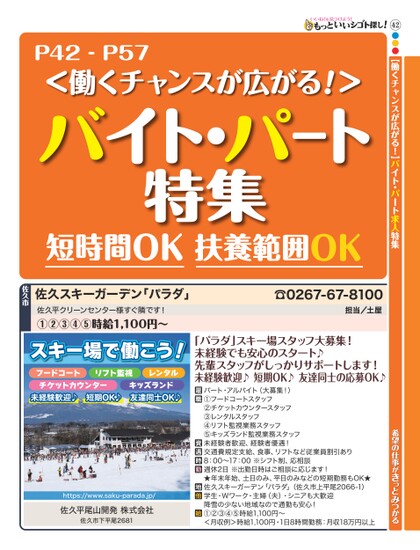 42●●●【働くチャンスが広がる!】バイト・パート求人特集P42-P57<働くチャンスが広がる!>バイト・パート特集短時間OK扶養範囲OK希望の仕事がきっとみつかるパート・アルバイト(大募集!)①フードコートスタッフ②チケットカウンタースタッフ③レンタルスタッフ④リフト監視業務スタッフ⑤キッズランド監視業務スタッフ未経験者歓迎、経験者優遇!交通費規定支給、食事、リフトなど従業員割引あり8:00〜17:00※シフト制、応相談週休2日※出勤日時はご相談に応じます!★年末年始、土日のみ、平日のみなどの短期勤務もOK★佐久スキーガーデン「パラダ」(佐久市上平尾2066-1)学生・Wワーク・主婦(夫)・シニアも大歓迎降雪の少ない地域なので通勤も安心!①②③④⑤時給1,100円〜<月収例>時給1,100円・1日8時間勤務:月収18万円以上「パラダ」スキー場スタッフ大募集!未経験でも安心のスタート♪先輩スタッフがしっかりサポートします!未経験歓迎♪短期OK♪友達同士の応募OK♪スキー場で働こう!フードコートリフト監視レンタルチケットカウンターキッズランド未経験歓迎♪短期OK♪友達同士OK♪https://www.saku-parada.jp/佐久平尾山開発株式会社佐久市下平尾2681☎0267-67-8100担当/土屋佐久スキーガーデン「パラダ」佐久平クリーンセンター様すぐ隣です!①②③④⑤時給1,100円〜佐久市