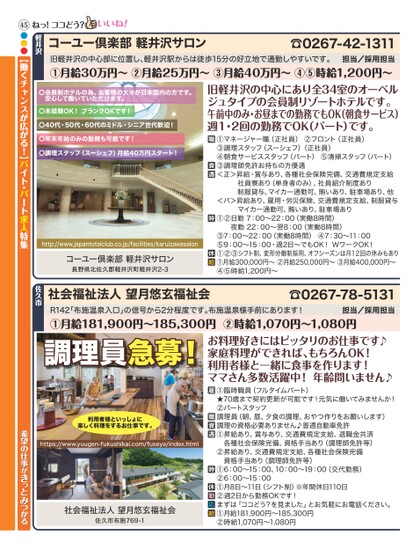 担当/採用担当旧軽井沢の中心部に位置し、軽井沢駅からは徒歩15分の好立地で通勤しやすいです。①月給30万円〜②月給25万円〜③月給40万円〜④⑤時給1,200円〜〇会員制ホテルの為、お客様の大半が日本国内の方です。安心して働いていただけます。〇未経験OK!ブランクOKです!〇40代・50代・60代のミドル・シニア世代歓迎!〇年末年始のみの勤務も可能です!〇調理スタッフ(スーシェフ)月給40万円スタート!http://www.japantotalclub.co.jp/facilities/karuizawasalonコーユー倶楽部軽井沢サロン長野県北佐久郡軽井沢町軽井沢2-3旧軽井沢の中心にあり全34室のオーベルジュタイプの会員制リゾートホテルです。午前中のみ・お昼までの勤務でもOK(朝食サービス)週1・2回の勤務でOK(パート)です。①マネージャー職(正社員)②フロント(正社員)③調理スタッフ(スーシェフ)(正社員)④朝食サービススタッフ(パート)⑤清掃スタッフ(パート)③調理師免許お持ちの方優遇<正>昇給・賞与あり、各種社会保険完備、交通費規定支給社員寮あり(単身者のみ)、社員紹介制度あり制服貸与、マイカー通勤可、賄いあり、駐車場あり、他<パ>昇給あり、雇用・労災保険、交通費規定支給、制服貸与マイカー通勤可、賄いあり、駐車場あり①②日勤7:00〜22:00(実働8時間)夜勤22:00〜翌8:00(実働8時間)③7:00〜22:00(実働8時間)④7:30〜11:00⑤9:00〜15:00・週2日〜でもOK!WワークOK!①②③シフト制、変形労働制採用、オフシーズンは月12回の休みもあり①月給300,000円〜②月給250,000円〜③月給400,000円〜④⑤時給1,200円〜☎0267-42-1311コーユー倶楽部軽井沢サロン軽井沢ねっ!ココどう?45●●●【働くチャンスが広がる!】バイト・パート求人特集☎0267-78-5131社会福祉法人望月悠玄福祉会佐久市R142「布施温泉入口」の信号から2分程度です。布施温泉様手前にあります!①月給181,900円〜185,300円②時給1,070円〜1,080円担当/採用担当調理員急募!お料理好きにはピッタリのお仕事です♪家庭料理ができれば、もちろんOK!利用者様と一緒に食事を作ります!ママさん多数活躍中!年齢問いません♪①臨時職員(フルタイムパート)★70歳まで契約更新が可能です!元気に働いてみませんか!②パートスタッフ調理員(朝、昼、夕食の調理、おやつ作りをお願いします)調理の資格必要ありません♪普通自動車免許①昇給あり、賞与あり、交通費規定支給、退職金共済各種社会保険完備、資格手当あり(調理師免許等)②昇給あり、交通費規定支給、各種社会保険完備資格手当あり(調理師免許等)①6:00〜15:00、10:00〜19:00(交代勤務)②6:00〜15:00①月8日〜11日(シフト制)※年間休日110日②週2日から勤務OKです!まずは「ココどう?を見ました」とお気軽にお電話ください。①月給181,900円〜185,300円②時給1,070円〜1,080円利用者様といっしょに楽しく料理をするお仕事です。https://www.yuugen-fukushikai.com/fuseya/index.html社会福祉法人望月悠玄福祉会佐久市布施769-1希望の仕事がきっとみつかる