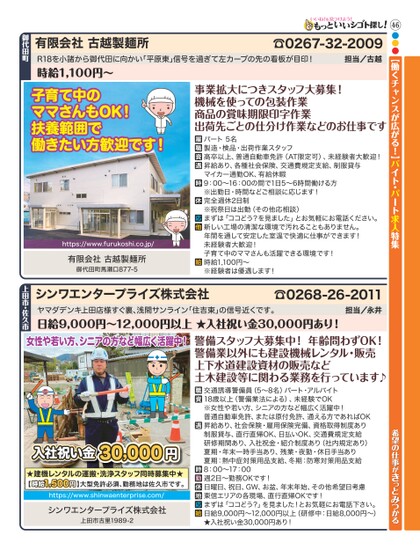 46●●●【働くチャンスが広がる!】バイト・パート求人特集有限会社古越製麺所R18を小諸から御代田に向かい「平原東」信号を過ぎて左カーブの先の看板が目印!時給1,100円〜☎0267-32-2009担当/古越子育て中のママさんもOK!扶養範囲で働きたい方歓迎です!https://www.furukoshi.co.jp/有限会社古越製麺所御代田町馬瀬口877-5事業拡大につきスタッフ大募集!機械を使っての包装作業商品の賞味期限印字作業出荷先ごとの仕分け作業などのお仕事ですパート5名製造・検品・出荷作業スタッフ高卒以上、普通自動車免許(AT限定可)、未経験者大歓迎!昇給あり、各種社会保険、交通費規定支給、制服貸与マイカー通勤OK、有給休暇9:00〜16:00の間で1日5〜6時間働ける方※出勤日・時間などご相談に応じます!完全週休2日制※祝祭日は出勤(その他応相談)まずは「ココどう?を見ました」とお気軽にお電話ください。新しい工場の清潔な環境で汚れることもありません。年間を通して安定した室温で快適に仕事ができます!未経験者大歓迎!子育て中のママさんも活躍できる環境です!時給1,100円〜※経験者は優遇します!シンワエンタープライズ株式会社☎0268-26-2011ヤマダデンキ上田店様すぐ裏、浅間サンライン「住吉東」の信号近くです。日給9,000円〜12,000円以上★入社祝い金30,000円あり!担当/永井御代田町上田市・佐久市希望の仕事がきっとみつかる交通誘導警備員(5〜8名)パート・アルバイト18歳以上(警備業法による)、未経験でOK※女性や若い方、シニアの方など幅広く活躍中!普通自動車免許、または原付免許、通える方であればOK昇給あり、社会保険・雇用保険完備、資格取得制度あり制服貸与、直行直帰OK、日払いOK、交通費規定支給研修期間あり、入社祝金・紹介制度あり(社内規定あり)夏期・年末一時手当あり、残業・夜勤・休日手当あり夏期:熱中症対策用品支給、冬期:防寒対策用品支給8:00〜17:00週2日〜勤務OKです!日曜日、祝日、GW、お盆、年末年始、その他希望日考慮東信エリアの各現場、直行直帰OKです!まずは「ココどう?」を見ました!とお気軽にお電話下さい。日給9,000円〜12,000円以上(研修中:日給8,000円〜)★入社祝い金30,000円あり!警備スタッフ大募集中!年齢問わずOK!警備業以外にも建設機械レンタル・販売上下水道建設資材の販売など土木建設等に関わる業務を行っています♪女性や若い方、シニアの方など幅広く活躍中!入社祝い金30,000円★建機レンタルの運搬・洗浄スタッフ同時募集中★【】大型免許必須、勤務地は佐久市です。時給1,500円https://www.shinwaenterprise.com/シンワエンタープライズ株式会社上田市古里1989-2