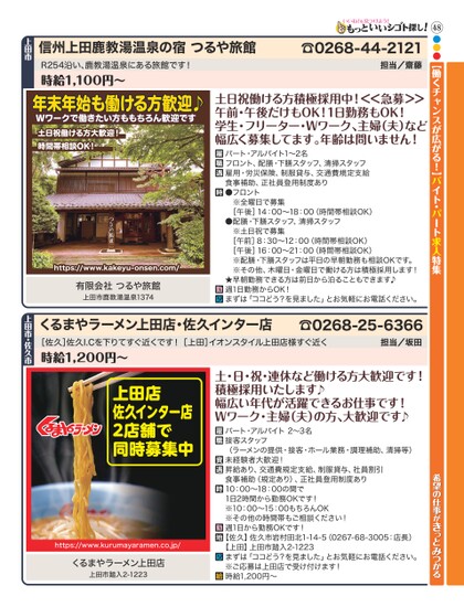 48●●●【働くチャンスが広がる!】バイト・パート求人特集希望の仕事がきっとみつかる☎0268-44-2121担当/齋藤信州上田鹿教湯温泉の宿つるや旅館R254沿い、鹿教湯温泉にある旅館です!時給1,100円〜上田市年末年始働ける方歓迎♪も働る方歓迎♪Wワークで働きたい方ももちろん歓迎です土日祝働ける方大歓迎!時間帯相談OK!https://www.kakeyu-onsen.com/有限会社つるや旅館上田市鹿教湯温泉1374土日祝働ける方積極採用中!<<急募>>午前・午後だけもOK!1日勤務もOK!学生・フリーター・Wワーク、主婦(夫)など幅広く募集してます。年齢は問いません!パート・アルバイト1〜2名フロント、配膳・下膳スタッフ、清掃スタッフ雇用・労災保険、制服貸与、交通費規定支給食事補助、正社員登用制度あり●フロント※全曜日で募集[午後]14:00〜18:00(時間帯相談OK)●配膳・下膳スタッフ、清掃スタッフ※土日祝で募集[午前]8:30〜12:00(時間帯相談OK)[午後]16:00〜21:00(時間帯相談OK)※配膳・下膳スタッフは平日の早朝勤務も相談OKです。※その他、木曜日・金曜日で働ける方は積極採用します!★早朝勤務できる方は前日から泊ることもできます♪週1日勤務からOK!まずは「ココどう?を見ました」とお気軽にお電話ください。くるまやラーメン上田店・佐久インター店☎0268-25-6366[佐久]佐久I.Cを下りてすぐ近くです![上田]イオンスタイル上田店様すぐ近く時給1,200円〜担当/坂田上田市・佐久市上田店佐久インター店2店舗で同時募集中https://www.kurumayaramen.co.jp/くるまやラーメン上田店上田市踏入2-1223土・日・祝・連休など働ける方大歓迎です!積極採用いたします♪幅広い年代が活躍できるお仕事です!Wワーク・主婦(夫)の方、大歓迎です♪パート・アルバイト2〜3名接客スタッフ(ラーメンの提供・接客・ホール業務・調理補助、清掃等)未経験者大歓迎!昇給あり、交通費規定支給、制服貸与、社員割引食事補助(規定あり)、正社員登用制度あり10:00〜18:00の間で1日2時間から勤務OKです!※10:00〜15:00もちろんOK※その他の時間帯もご相談ください!週1日から勤務OKです!【佐久】佐久市岩村田北1-14-5(0267-68-3005:店長)【上田】上田市踏入2-1223まずは「ココどう?を見ました」とお気軽にお電話ください。※ご応募は上田店で受け付けます!時給1,200円〜