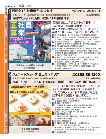 ☎0267-68-1200担当/採用担当イオンモール佐久平店様より浅科方面へ約1km、新幹線高架橋下です!月給23万円〜28万円※経験により優遇します。浅間タイヤ技術販売株式会社佐久市ねっ!ココどう?員正社募集短期アルバイト時給1,200円〜(経験者優遇)1,600円(随時スタートから12月中旬〜下旬まで)会社見学OK!49●●●【働くチャンスが広がる!】バイト・パート求人特集業務好調につき男女スタッフ募集中!未経験の方を積極採用中です!働くタイヤの専門店なのでニーズもあり必要とされているお仕事です!会社見学OK!タイヤ整備スタッフ(正社員1名)※整備等経験者歓迎!45歳以下(キャリア形成の為)、普通自動車免許(AT限定不可)※中型・大型自動車免許、フォークリフト免許あれば尚可昇給・賞与(業績による)、交通費規定支給、マイカー・バイク通勤可労災保険、雇用保険、社会保険完備・福利厚生倶楽部加入8:30〜17:00(実働7時間・休憩90分)日曜、祝日、第2土曜日(繁忙期は除く)、年末年始、GW、夏季休暇、繁忙期は休日出勤あり(約10日・休日出勤手当有り)閑散期の連休は比較的長く休めます。(会社規定による休日は当社HPにて確認できます。)まずは「ココどう?を見ました」とお気軽にお電話ください。連絡後、履歴書をご郵送いただくか、ご持参ください。書類選考後、面接日をご連絡いたします。<<同時募集中!>>フロント・受付・事務スタッフ(正社員)月給180,000円〜200,000円※未経験者歓迎します!お気軽にご連絡ください。上田市下之郷にあるジェラートと焼き菓子のお店です。月給19.2万円〜※アルバイト同時募集一般時給1,100円〜、高校生時給1,070円〜担当/白井・服部☎0268-39-1200ジェラートショップ豊上モンテリア上田市ジェラートと焼き菓子のお店豊上モンテリア<正社員>接客・販売スタッフ急募中!作りたてのジェラートや焼き菓子などを接客販売する楽しいお仕事です。ジェラートショップ豊上モンテリアの接客・販売スタッフ正社員1名<急募>未経験でもOK!高卒以上、要普通免許社会保険完備、賞与あり、昇給あり、退職金制度あり交通費支給(当社規定)、制服貸与、残業代支給慶弔見舞金制度あり、家族手当あり9:15〜18:00(早出ありのシフト制)週休2日制(シフト制)※定休日は水曜日(祝日の場合は別の日に振り替え営業)年末年始※年間115日上田市下之郷1525-1まずは「ココどう?を見ました」とお電話下さい♪ジェラートと焼き菓子のお店です。お店の前には屋根付きのテラス席もあり、作りたてジェラートやバウムクーヘンなどの焼き菓子を販売するお店です。月給192,000円〜★職場見学からスタートできます♪質問などお気軽にお電話ください!https://www.hojo-seika.jp豊上製菓株式会社上田市下之郷1525-1(本社)希望の仕事がきっとみつかるhttps://asama-tire.com浅間タイヤ技術販売株式会社佐久市塚原465-1