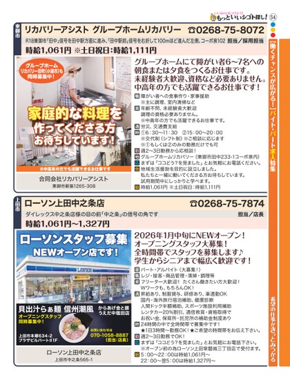 54●●●【働くチャンスが広がる!】バイト・パート求人特集グループホームリカバリー田町(小諸市)も同時募集中!グループホームにて障がい者6〜7名への朝食または夕食をつくるお仕事です。未経験者大歓迎、資格など必要ありません。中高年の方でも活躍できるお仕事です!R18東御市「田中」信号を田中駅方面に進み、田中駅前」信号を右折して100mほど進んだ左側、コーポ泉102担当/採用担当時給1,061円※土日祝日:時給1,111円☎0268-75-8072リカバリーアシストグループホームリカバリー東御市家庭的な料理を作ってくださる方お待ちしています!※中高年の方でも活躍できるお仕事です合同会社リカバリーアシスト東御市新張1265-308障がい者への食事作り・家事援助※主に調理、室内清掃など年齢不問、未経験者大歓迎調理の資格必要ありません。※中高年の方でも活躍できるお仕事です。労災、交通費支給①6:30〜11:30②15:00〜20:00※交代制(シフト制)※ご相談に応じます※①もしくは②のみの勤務だけでも可週2〜3日勤務から応相談!グループホームリカバリー(東御市田中233-1コーポ泉内)まずは「ココどう?を見ました」とお気軽にお電話ください。地域生活援助を目的に設立しました。私たちと一緒に働いてくださる方お待ちしています。試用期間中にしっかりと学べます。時給1,061円※土日祝日:時給1,111円☎0268-75-7874担当/店長ローソン上田中之条店ダイレックス中之条店様の目の前「中之条」の信号の角です時給1,061円〜1,327円上田市ローソンスタッフ募集NEWオープン店です!2026年1月中旬にNEWオープン!オープニングスタッフ大募集!全時間帯でスタッフを募集します♪学生からシニアまで幅広く歓迎です!希望の仕事がきっとみつかるパート・アルバイト(大募集!)レジ・接客・商品管理・清掃・調理等フリーター大歓迎!たくさん働きたい方大歓迎!Wワークも、もちろんOK!昇給あり、制服貸与、研修あり、車通勤OK国内・海外旅行宿泊補助、健康診断人間ドック半額補助、スポーツ施設利用補助レンタカー20%割引、通信教育・資格取得でお祝い金、保育所・託児所の補助金制度あり24時間の中で全時間帯で募集中です!★1日3時間〜勤務OK!★ご希望の時間帯をお伝え下さい。週2〜3日勤務でOK!まずは「ココどう?を見ました」とお気軽にお電話下さい。※オープン前の為ローソン上田常磐城三丁目店で受付ます。5:00〜22:00は時給1,061円〜22:00〜翌5:00は時給1,327円〜貝出汁らぁ麺信州潮風オープニングスタッフ同時募集中!からあげ金と銀うえだ中塩田店上田市本郷634-2プラザビルパートⅡ1Fお問い合わせは070-1058-8887(担当:店長)ローソン上田中之条店上田市中之条565-1