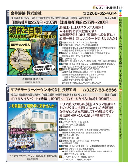 58●●●時代をリードする!ものづくり工場・製造ワーク求人特集!おうちでココどう!https://cocodou.info東部湯の丸インター近く!浅間サンライン「中央公園入口」信号からスグです!【経験者】月給25万円〜33万円【未経験者】月給22万円〜28万円担当/石田☎0268-62-4614金井溶接株式会社東御市週休2日制ラジオを聴きながらお仕事できます♪溶接工・仕上げスタッフ大募集!★年齢問わず大歓迎です♪★職場見学もOK!質問等もお気軽に♪心機一転!新しいスタート切りませんか!NEWマシン導入未経験者・経験者どちらも大歓迎!https://canaiweldingkk.com金井溶接株式会社東御市鞍掛25-22溶接及び仕上げスタッフ(正社員)4名半自動溶接・グラインダー作業の経験者※同業種で働いていた方や溶接経験者等でも大歓迎です♪※未経験の方も募集中です!ご相談下さい♪昇給あり、賞与あり、社会保険完備、交通費規定支給制服貸与(ゴーグル・マスクあり)8:00〜17:00週休2日制(会社カレンダーあり)※他、GW・お盆・年末年始まずは「ココどう?を見ました」とお気軽にお電話ください。※HPのエントリーフォームからのご応募もOKです♪【経験者】月給250,000円〜330,000円★能力により月給300,000円スタート可能です!★繁忙期は残業をお願いすることがありますが月給は「300,000円以上」可能です!★稼げて安心安定のお仕事です♪【未経験者】月給220,000円〜280,000円佐久大橋を野沢方面に向かい「南部交番前」の信号を右折するとすぐです!①フルタイムパート:時給1,120円〜②パートタイム:時給1,090円〜担当/加藤☎0267-63-6666マブチモーターオーケン株式会社長野工場佐久市♪お気軽に工場見学に来ませんか♪子育て中のママさん多数活躍中♪https://okenseiko.comマブチモーターオーケン株式会社長野工場佐久市原578エリア拡大のため、製造スタッフ急募中!ものづくりに挑戦してみたい方大歓迎!女性がたくさん活躍している職場です♪和気あいあいとした楽しい職場です。製造スタッフ①フルタイムパート(2名募集)②パートタイム(1名募集)経験不問昇給あり、賞与あり(パートさんでも支給しています!)社会保険完備、制服貸与、交通費規定支給①8:30〜17:30②9:00〜16:00週休2日制(土、日)GW、お盆、年末年始※年間休日116日まずは「ココどう?を見ました」とお気軽にお電話ください。★子育て中のママさん多数活躍中♪★学校行事や、お子さんの体調不良など急なお休みにも柔軟に対応いたします。①フルタイムパート:時給1,120円〜②パートタイム:時給1,090円〜