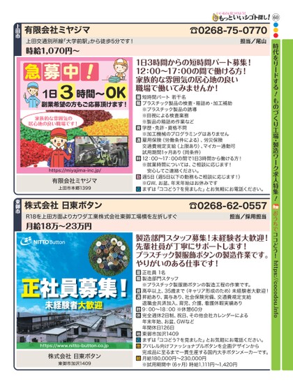 60●●●時代をリードする!ものづくり工場・製造ワーク求人特集!おうちでココどう!https://cocodou.info☎0268-75-0770担当/尾山有限会社ミヤジマ上田交通別所線「大学前駅」から徒歩5分です!時給1,070円〜上田市急募中!副業希望の方もご応募頂けます!1日3時間〜OK家族的な雰囲気の居心地の良い職場です!https://miyajima-inc.jp/有限会社ミヤジマ上田市本郷13991日3時間からの短時間パート募集!12:00〜17:00の間で働ける方!家族的な雰囲気の居心地の良い職場で働いてみませんか!短時間パート若干名プラスチック製品の検査・箱詰め・加工補助※プラスチック製品の誘導※目視による検査業務※製品の箱詰め作業など学歴・免許・資格不問※加工機械のプログラミングはありません雇用保険(労働条件による)、労災保険交通費規定支給(上限あり)、マイカー通勤可試用期間1ヶ月あり(同条件)12:00〜17:00の間で1日3時間から働ける方!※就業時間については、ご相談に応じます!安心してご連絡ください。週5日(週5日以下の勤務もご相談に応じます!)※GW、お盆、年末年始はお休みですまずは「ココどう?を見ました」とお気軽にお電話ください。☎0268-62-0557担当/採用担当株式会社日東ボタンR18を上田方面よりカワダ工業株式会社東御工場横を左折しすぐ月給18万〜23万円東御市製造部門スタッフ募集!未経験者大歓迎!先輩社員が丁寧にサポートします!プラスチック製服飾ボタンの製造作業です。やりがいのある仕事です!正社員募集!未経験者大歓迎https://www.nitto-button.co.jp株式会社日東ボタン東御市加沢1409正社員1名製造部門スタッフ※プラスチック製服飾ボタンの製造工程の作業です。高卒以上、35歳まで(キャリア形成のため)未経験者大歓迎!昇給あり、賞与あり、社会保険完備、交通費規定支給退職金共済加入、育児、介護、看護休暇実績あり9:00〜18:00※休憩60分完全週休2日制、祝日、その他会社カレンダーによる年末年始、お盆、GWなど年間休日126日東御市加沢1409まずは「ココどう?を見ました」とお気軽にお電話ください。アパレル向けファッショナブルボタンを企画デザインから完成品に至るまで一貫生産する国内大手ボタンメーカーです。月給180,000円〜230,000円※試用期間中(6ヶ月)時給1,111円〜1,420円