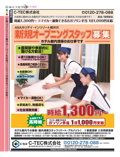 担当/採用担当大自然に囲まれた北軽井沢「ANAホリデイ・インリゾート軽井沢」でのお仕事です!時給1,300円〜※マイカー通勤できる方ガソリン手当1日1,000円支給☎0120-278-088ANAホリデイ・インリゾート軽井沢新規オープニングスタッフホテル館内清掃のお仕事です募集★農閑期や季節的に働ける方歓迎!★週1日勤務からOK!★午前中または、午後のみでもOK!★勤務時間ご相談ください★勤務時間は様々に対応!★未経験OK!★WワークOK!★マイカー通勤OK!★駐車場完備★昇給あり、制服貸与★社会保険完備未経験でも♪高時給時給1,300円〜マイカー通勤できる方ガソリン手当日円支給11,000ホテル館内での客室・館内清掃スタッフ(パート・アルバイト)①客室清掃②共用部清掃勤務地:ANAホリデイ・インリゾート軽井沢(中軽井沢駅から車で20分)群馬県吾妻郡長野原町北軽井沢2032-16勤務時間:①9:00〜15:00など②7:00〜12:00、10:00〜15:00、12:00〜18:00など、ご相談ください!C-TEC株式会社東京都新宿区岩戸町14神楽坂不二ビル-B1☎0120-278-088<軽井沢営業所>軽井沢町大字長倉18-122<応募受付>9:00〜19:00・土日も受付しています!担当/採用担当「ココどう?を見ました」とお気軽にお電話ください。https://www.ctec-ltd.com/63ねっ!ココどう?C-TEC株式会社北軽井沢●●●主婦・ママシフトで働ける!【ママを応援ページ】ママの就活&バイト特集!