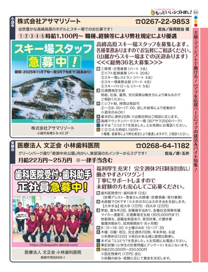 ●●●64主婦・ママシフトで働ける!【ママを応援ページ】ママの就活&バイト特集!高峰高原スキー場スタッフを募集します。各種業務ありますのでお気軽にご相談ください。(山麓からスキー場までの送迎あります)<<<総勢36名大募集>>>①降雪・圧雪業務(パート3名)②リフト監視業務(パート20名)③スキー場レストラン(パート4名)④スキー場業務全般(パート4名)⑤スキーパトロール(パート5名)交通費規定支給時給、社保、雇用、労災保険は働き方により異なるのでご相談ください。①シフト制、時間は相談可②〜⑤8:00〜17:00、但し天候等により変動あり※週末のみOK!基本的に週休2日制※出勤日時はご相談に応じます。高峰マウンテンパークスキー場(旧アサマ2000パーク)まずは「ココどう?を見ました」とお気軽にお電話ください。①②③④⑤時給1,100円〜※職種、経験等により弊社規定により優遇しますので、ご相談ください。自然豊かな高峰高原のホテルとスキー場でのお仕事です!①②③④⑤時給1,100円〜職種、経験等により弊社規定により優遇担当/採用担当堤☎0267-22-9853株式会社アサマリゾート小諸市スキー場スタッフ急募中!期間:2025年11月下旬〜翌3月下旬まで(延長あり)https://asama-resort.co.jp/株式会社アサマリゾート小諸市加増3-8-432F☎0268-64-1182担当/原・玉井グリーンパーク通り「東御中央公園」向かい、東部湯の丸インターからスグです!月給22万円〜25万円※一律手当含む医療法人文正会小林歯科医院東御市歯科医院受付・歯科助手正社員急募中!一緒に楽しく!働きましょう!https://kobayashi-dental.com/医療法人文正会小林歯科医院東御市常田898-1福利厚生充実!完全週休2日制(振替出勤なし)働きやすさバツグン!丁寧にサポートしますので未経験の方も安心してご応募ください。歯科医院受付・歯科助手(2名)(診療アシスト・患者さんの誘導・診療準備・受付兼務)未経験でOKです!※大卒の方には大卒手当を支給します。【大卒手当】短大卒(1万円)・四大卒(2万円)昇給、賞与年2回、各種諸手当あり、各種社会保険完備マイカー通勤可、交通費規定支給(月20,000円まで)制服貸与、退職金制度あり、育児休業、介護休業看護休暇あり、試用期間あり(6ヶ月間)8:15〜18:00※土曜のみ8:15〜17:30木曜・日曜・祝日、完全週休2日制、年末年始、お盆※年間休日122日※祝日がある週に振替出勤無しまずは「ココどう?を見ました」とお気軽にお電話ください。筆記試験(小学生の計算問題とアンケート)をおこないます。月給220,000円〜250,000円※固定残業代(1万円)含む※前職の給与・経験に応じて賃金を決定します。