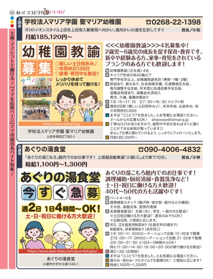 ☎0268-22-1398担当/小松R141イオンスタイル上田を上田常入郵便局へ向かい、真向かいの道を左折してすぐ月給185,120円〜幼稚園教諭募集◎嬉しい土日祝休み♪◎年間休日126日◎家事・育児中も歓迎!しっかり休めてメリハリを持って働ける!https://www.stmaria.jp学校法人マリア学園聖マリア幼稚園上田市常田2丁目2-1<<<幼稚園教諭>>>4名募集中!2歳児〜6歳児の成長を促す保育・教育です。新卒や経験ある方、家事・育児をされているブランクのある方でも歓迎します!幼稚園教諭(正社員)4名キャリア形成の為40歳以下専門学校卒以上、幼稚園教諭免許(専修・1種・2種)昇給あり、賞与あり、社会保険完備、交通費規定支給、毎月調整手当支給、年末度に処遇改善手当支給、退職金制度あり、退職金共済加入育児、介護、看護休暇あり①8:15〜17:15②7:30〜16:30※シフト制週休2日制(嬉しい土日祝休み♪)、年末年始、お盆休み、他※年間休日126日まずは「ココどう?を見ました」とお気軽にお電話ください。メールからの応募もOK!shiawase@stmaria.jp丁寧なOJTがありますので、疑問や不安があればすぐに聞くことができる体制が整っています◎安心して仕事に慣れていけるよう、しっかりとフォローいたします。月給185,120円〜学校法人マリア学園聖マリア幼稚園上田市●●●65ねっ!ココどう?☎090-4006-4832担当/小林「あぐりの湯こもろ」館内でのお仕事です!上信越自動車道「小諸I.C」より車で10分。時給1,100円〜1,300円あぐりの湯食堂今すぐ急募2土・日・祝日に働ける方大歓迎!日1日時間〜OK!4週https://www.slow-style.com/gourmet/gou/あぐりの湯食堂小諸市大字大久保1145-1あぐりの湯こもろ館内でのお仕事です!調理補助・厨房清掃・食器洗浄など!土・日・祝日に働ける方大歓迎!40代〜50代の方も活躍中です!パート4〜6名調理補助スタッフ(揚げ物・焼き物・盛付などの補助)その他、食器洗浄、厨房内清掃未経験者歓迎!主婦(夫)、学生、一般の方も歓迎!※土日祝日働ける方大歓迎!週末のみでもOK!※出勤日時、ご相談に応じます。労災、正社員登用制度あり(社員定年60歳まで)制服貸与、研修期間あり(条件同じ)①9:00〜11:00のローテーションで出勤15:00まで勤務②15:00〜17:00のローテーションで出勤21:00まで勤務③9:00〜21:00※1日4〜5時間からOK!特に11:00〜14:00・18:00〜20:00の間で働ける方歓迎!週2〜3日(応相談)まずは「ココどう?を見ました」とお気軽にお電話ください。昼のみ・夜のみ・フルタイムでも勤務OK!ご相談に応じます!時給1,100円〜1,300円あぐりの湯食堂小諸市主婦・ママシフトで働ける!【ママを応援ページ】ママの就活&バイト特集!