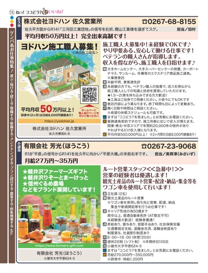 ☎0267-68-8155担当/田村佐久平方面からR141「三河田工業団地」の信号を右折、樫山工業様を過ぎてスグ。平均月収50万円以上!完全出来高制です!株式会社ヨドハン佐久営業所佐久市ねっ!ココどう?ヨドハン施工職人募集!<商品施工請負>平均月収50研修中(2ヶ月)は日給8,000円補償あり!https://yodohan.jp万円以上!ホームページ職人紹介ページをぜひご覧ください株式会社ヨドハン佐久営業所佐久市横和6-8施工職人大募集中!未経験でOKです♪やり甲斐ある、安心して働ける仕事です!ベテランの職人さんが指導します。収入を得ながら、施工職人を目指せます♪大手ホームセンター、大手スーパーセンターの物置、カーポートテラス、サンルーム、外構等のエクステリア商品施工請負。※業務委託年齢不問、要普通免許未経験の方でも、ベテラン職人の指導で、収入を得ながら施工職人としての知識と技術を習得していただけます。★1.5〜2t車を持ち込みできる方大歓迎!★工具はご自身でご用意ください。※徐々にでもOKです委託内容により異なります。終了時間も日によって変動あり。働く日数や時間はご相談ください。※希望の休暇スケジュールも可能です。まずは「ココどう?を見ました」とお気軽にお電話ください。業務請負契約ですので、施工件数に応じて収入が増えます。関東・東北・中京エリアで年間約20,000件の物件がありやればやるだけ収入増になります。平均月収500,000円以上!※2ヶ月間の日給8,000円補償あり!☎0267-23-9068担当/美齊津(みさいず)R18「平原」の信号からR141を佐久平に向かい「平原大橋」の手前右手です。月給27万円〜35万円有限会社芳光(ほうこう)小諸市★軽井沢ファーマーズギフト★軽井沢りぞーとまーけっと★信州ぐるめ農場などをブランド展開しています!https://www.farmers-gift.com有限会社芳光(ほうこう)小諸市大字平原624-5ルート営業スタッフ<<急募中!>>営業の経験者は優遇します!観光土産品のルート営業・配達・納品・集金等をワゴン車を使用して行います!正社員(2名)観光土産品のルート営業※ワゴン車を使用し取引先に営業、配達、納品集金や新規開拓等を行うお仕事です!キャリア形成の為50歳まで高卒以上、普通自動車免許(AT限定不可)未経験者大歓迎!経験者優遇!昇給あり、賞与あり、皆勤手当あり、社会保険完備交通費規定支給、退職金共済、退職金制度あり制服貸与、社員割引制度あり8:00〜18:00(休憩120分)週休2日制(シフト制)※年間休日105日小諸市大字平原624-5まずは「ココどう?を見ました」とお気軽にお電話ください。月給270,000円〜350,000円※研修中:時給1,200円71●●●ゲンバ系お仕事特集!運ぶ・届ける・建てる・警備する・整備する・メンテナンスする・プラン設計する・農業する・収集廃棄するetc.
