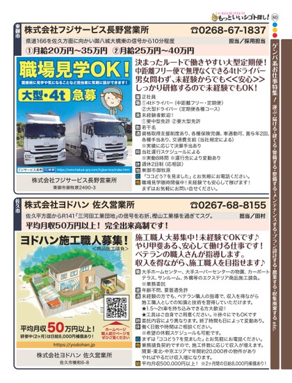 80●●●ゲンバ系お仕事特集!運ぶ・届ける・建てる・警備する・整備する・メンテナンスする・プラン設計する・農業する・収集廃棄するetc.☎0268-67-1837担当/採用担当県道166を佐久方面に向かい御八城大橋東の信号から10分程度①月給20万円〜35万円②月給25万円〜40万円株式会社フジサービス長野営業所東御市職場見学OK!面接前に見学や気になることなど担当者に気軽に話ができます!大型・4t急募決まったルートで働きやすい大型定期便!中距離フリー便で無理なくできる4tドライバー男女問わず、未経験からでも<<安心>>しっかり研修するので未経験でもOK!正社員①4tドライバー(中距離フリー・定期便)②大型ドライバー(定期便各種コース)未経験者歓迎!①要中型免許②要大型免許若干名資格取得支援制度あり、各種保険完備、車通勤可、賞与年2回、各種手当あり、交通費支給(当社規定による)※実績に応じて決算手当あり当社運行スケジュールによる※実働8時間※運行先により変動あり週休2日制(応相談)東御市御牧原「ココどう?を見ました」とお気軽にお電話ください。職場見学随時開催中!未経験でも安心して稼げます!まずはお気軽にお問い合せください。☎0267-68-8155担当/田村佐久平方面からR141「三河田工業団地」の信号を右折、樫山工業様を過ぎてスグ。平均月収50万円以上!完全出来高制です!ヨドハン施工職人募集!<商品施工請負>平均月収50研修中(2ヶ月)は日給8,000円補償あり!https://yodohan.jp万円以上!ホームページ職人紹介ページをぜひご覧ください株式会社ヨドハン佐久営業所佐久市横和6-8施工職人大募集中!未経験でOKです♪やり甲斐ある、安心して働ける仕事です!ベテランの職人さんが指導します。収入を得ながら、施工職人を目指せます♪大手ホームセンター、大手スーパーセンターの物置、カーポートテラス、サンルーム、外構等のエクステリア商品施工請負。※業務委託年齢不問、要普通免許未経験の方でも、ベテラン職人の指導で、収入を得ながら施工職人としての知識と技術を習得していただけます。★1.5〜2t車を持ち込みできる方大歓迎!★工具はご自身でご用意ください。※徐々にでもOKです委託内容により異なります。終了時間も日によって変動あり。働く日数や時間はご相談ください。※希望の休暇スケジュールも可能です。まずは「ココどう?を見ました」とお気軽にお電話ください。業務請負契約ですので、施工件数に応じて収入が増えます。関東・東北・中京エリアで年間約20,000件の物件がありやればやるだけ収入増になります。平均月収500,000円以上!※2ヶ月間の日給8,000円補償あり!フジサービス長野https://www.hakuai-grp.com/fujiservice/index.html株式会社フジサービス長野営業所東御市御牧原2490-3株式会社ヨドハン佐久営業所佐久市