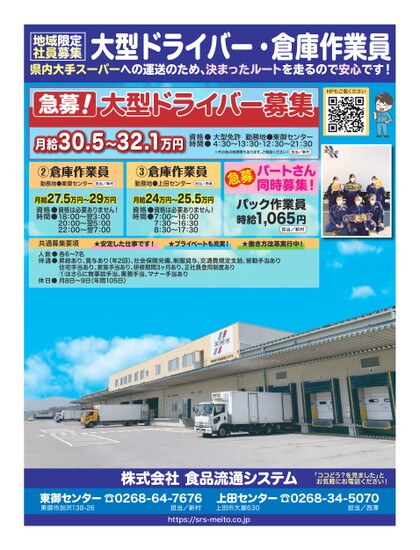 地域限定社員募集県内大手スーパーへの運送のため、決まったルートを走るので安心です!大型ドライバー・倉庫作業員大型ドライバー募集HPもご覧ください急募!月給30.5〜32.1万円資格●時間●大型免許勤務地●東御センター4:30〜13:30・12:30〜21:30※その他の時間帯もあります。ご相談ください!担当/新村②倉庫作業員勤務地●東御センター担当/新村③倉庫作業員勤務地●上田センター担当/西澤月給27.5万円〜29万円資格●時間●資格は必要ありません!18:00〜翌3:0020:00〜翌5:0022:00〜翌7:00月給24万円〜25.5万円資格●時間●資格は必要ありません!7:00〜16:007:30〜16:308:30〜17:30パートさん同時募集!急募パック作業員時給円1,065担当/新村共通募集要項人数●待遇●★安定した仕事です!★プライベートも充実!★働き方改革実行中!各6〜7名昇給あり、賞与あり(年2回)、社会保険完備、制服貸与、交通費規定支給、皆勤手当あり住宅手当あり、家族手当あり、研修期間3ヶ月あり、正社員登用制度あり①はさらに無事故手当、乗務手当、マナー手当あり月8日〜9日(年間105日)休日●株式会社食品流通システム「ココどう?を見ました」とお気軽にお電話ください!東御センター東御市加沢138-26☎0268-64-7676上田センター☎0268-34-5070担当/西澤担当/新村https://srs-meito.co.jp上田市大屋630