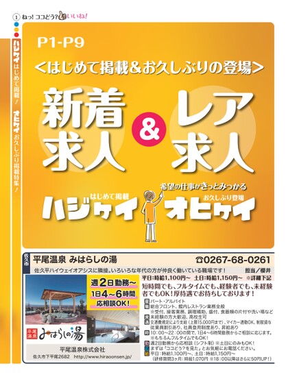 <はじめて掲載&お久しぶりの登場>新着求人&レア求人はじめて掲載希望の仕事がきっとみつかるお久しぶり登場佐久平ハイウェイオアシスに隣接。いろいろな年代の方が仲良く働いている職場です!平尾温泉みはらしの湯日2週1日4応相談OK!勤務〜時間6〜平尾温泉株式会社佐久市下平尾2682http://www.hiraoonsen.jp/☎0267-68-0261担当/櫻井平日:時給1,100円〜土日:時給1,150円〜※詳細下記短時間でも、フルタイムでも、経験者でも、未経験者でもOK!厚待遇でお待ちしております!パート・アルバイト総合フロント、館内レストラン業務全般※受付、接客業務、調理補助、盛付、食器類の片付や洗い場など未経験の方大歓迎、高校生可交通費規定により支給(上限15,000円まで)、マイカー通勤OK、制服貸与従業員割引あり、社員登用制度あり、昇給あり10:00〜22:00の間で、1日4〜6時間勤務からご相談に応じます。※もちろんフルタイムでもOK!週2日勤務から応相談(シフト制)※土日にのみもOK!まずは「ココどう?を見た」とお気軽にお電話ください。平日:時給1,100円〜、土日:時給1,150円〜(研修期間3ヶ月:時給1,070円※18:00以降はさらに50円UP!)はじめて掲載!お久しぶり掲載特集!佐久市ねっ!ココどう?P1-P91●●●