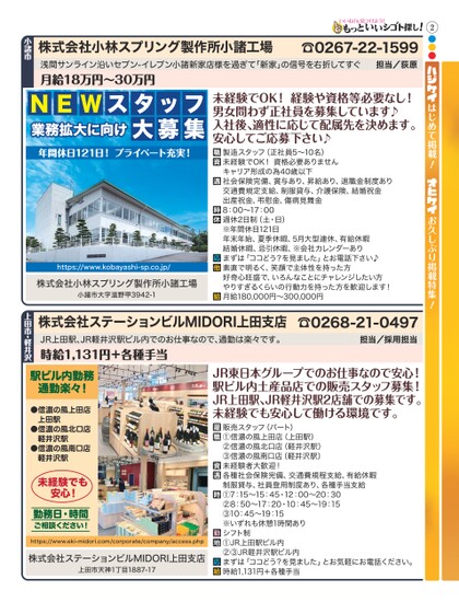 2●●●はじめて掲載!お久しぶり掲載特集!浅間サンライン沿いセブン-イレブン小諸新家店様を過ぎて「新家」の信号を右折してすぐ月給18万円〜30万円NEWスタッフ業務拡大に向け大募集年間休日121日!プライベート充実!https://www.kobayashi-sp.co.jp/株式会社小林スプリング製作所小諸工場小諸市大字滋野甲3942-1未経験でOK!経験や資格等必要なし!男女問わず正社員を募集しています♪入社後、適性に応じて配属先を決めます。安心してご応募下さい♪製造スタッフ(正社員5〜10名)未経験でOK!資格必要ありませんキャリア形成の為40歳以下社会保険完備、賞与あり、昇給あり、退職金制度あり交通費規定支給、制服貸与、介護保険、結婚祝金出産祝金、弔慰金、傷病見舞金8:00〜17:00週休2日制(土・日)※年間休日121日年末年始、夏季休暇、5月大型連休、有給休暇結婚休暇、忌引休暇、※会社カレンダーありまずは「ココどう?を見ました」とお電話下さい♪素直で明るく、笑顔で主体性を持った方好奇心旺盛で、いろんなことにチャレンジしたい方やりすぎるくらいの行動力を持った方を歓迎します!月給180,000円〜300,000円☎0267-22-1599担当/荻原株式会社小林スプリング製作所小諸工場小諸市☎0268-21-0497担当/採用担当株式会社ステーションビルMIDORI上田支店JR上田駅、JR軽井沢駅ビル内でのお仕事なので、通勤は楽々です。時給1,131円+各種手当上田市・軽井沢駅ビル内勤務通勤楽々!●信濃の風上田店上田駅●信濃の風北口店軽井沢駅●信濃の風南口店軽井沢駅未経験でも安心!勤務日・時間ご相談ください!https://www.eki-midori.com/corporate/company/access.php株式会社ステーションビルMIDORI上田支店上田市天神1丁目1887-17JR東日本グループでのお仕事なので安心!駅ビル内土産品店での販売スタッフ募集!JR上田駅、JR軽井沢駅2店舗での募集です。未経験でも安心して働ける環境です。販売スタッフ(パート)①信濃の風上田店(上田駅)②信濃の風北口店(軽井沢駅)③信濃の風南口店(軽井沢駅)未経験者大歓迎!各種社会保険完備、交通費規程支給、有給休暇制服貸与、社員登用制度あり、各種手当支給①7:15〜15:45・12:00〜20:30②8:50〜17:20・10:45〜19:15③10:45〜19:15※いずれも休憩1時間ありシフト制①JR上田駅ビル内②③JR軽井沢駅ビル内まずは「ココどう?を見ました」とお気軽にお電話ください。時給1,131円+各種手当