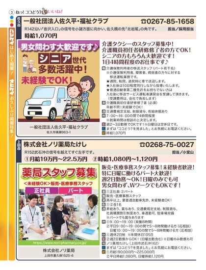 ☎0267-85-1658担当/採用担当R142沿い「沓沢入口」の信号を小諸方面に向かい、佐久橋の先「北岩尾」の角です。時給1,070円男女問わす大歓迎です♪シニア世代多数活躍中!未経験でOK!一般社団法人佐久平・福祉クラブ佐久市鳴瀬963-1介護タクシーのスタッフ募集中!介護職員初任者研修修了者の方でOK!シニアの方もちろん大歓迎です!1日4時間程度のお仕事です♪介護保険利用者の移送スタッフ(パート若干名)※介護保険利用者、障害者、病弱者の方々に対する移送運転業務です。★通院、転院、退院時に車で送迎します。★入社後は10日程度同行しながら指導いたします。★普通自動車第二種免許をお持ちでない方は入社後に移送サービス運転者講習会を受講して頂きます。(受講費用は、会社で負担します)介護職員初任者研修修了者(必須)年齢不問!未経験でOK!交通費規定支給、制服貸与、有給休暇あり7:00〜16:00の間で4時間程度※就業時間は相談の上決定します。週2〜3日勤務でOKです!※日曜日は定休日です。まずは「ココどう?を見ました」とお気軽にお電話ください。時給1,070円一般社団法人佐久平・福祉クラブ佐久市ねっ!ココどう?3●●●はじめて掲載!お久しぶり掲載特集!☎0268-75-0027担当/小宮山R152武石沖の信号を越えてすぐ左手です。①月給19万円〜22.5万円②時給1,080円〜1,120円薬局スタッフ募集<未経験OK>販売・医療事務スタッフ正社員パートhttps://www.nori-pharmacy.co.jp/株式会社ノリ薬局上田市蒼久保1525-6販売・医療事務スタッフ募集!未経験者歓迎!特に日曜に働けるパート大歓迎!週2日勤務〜OK!日曜のみでも可男女問わず、WワークでもOKです!①正社員②パート販売・医療事務スタッフ高卒以上、要普通自動車免許、未経験者OK!①②各1名昇給あり、賞与あり、交通費規定支給、制服貸与、社員購買割引制度あり、車通勤可、駐車場完備※パートでも賞与あります①9:00〜19:00(実働8時間)②平日9:00〜19:00の間で5〜8時間働ける方(応相談)日曜10:00〜19:00の間で5〜8時間働ける方(応相談)①週休2日制※年間休日105日②週2日勤務からOK!(日曜出勤含む)※日曜のみ勤務も可ノリ薬局たけし(上田市武石沖162)まずは「ココどう?を見ました」とお気軽にお電話ください。①月給190,000円〜225,000円②平日時給1,080円、日曜時給1,120円株式会社ノリ薬局たけし上田市
