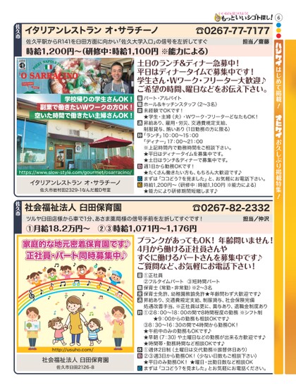 6●●●はじめて掲載!お久しぶり掲載特集!☎0267-77-7177担当/齋藤佐久平駅からR141を臼田方面に向かい「佐久大学入口」の信号を左折してすぐ時給1,200円〜(研修中:時給1,100円※能力による)イタリアンレストランオ・サラチーノ佐久市土日のランチ&ディナー急募中!平日はディナータイムで募集中です!学生さん・Wワーク・フリーター大歓迎♪ご希望の時間、曜日などをお伝え下さい。学校帰りの学生さんOK!副業で働きたいWワークの方OK!空いた時間で働きたい主婦さんOK!https://www.slow-style.com/gourmet/osarracino/イタリアンレストランオ・サラチーノ佐久市岩村田2329-1なんだ館D号室パート・アルバイトホール&キッチンスタッフ(2〜3名)未経験でOKです!★学生・主婦(夫)・Wワーク・フリーターどなたもOK!昇給あり、雇用・労災、交通費規定支給、制服貸与、賄いあり(1日勤務の方に限る)「ランチ」10:00〜15:00「ディナー」17:00〜21:00※上記時間内で勤務時間をご相談下さい。★平日はディナータイムを募集中です。★土日はランチ&ディナーで募集中です。週1日から勤務OKです!★たくさん働きたい方も、もちろん大歓迎です♪まずは「ココどう?を見ました」と、お気軽にお電話下さい。時給1,200円〜(研修中:時給1,100円※能力による)★能力により研修期間短縮します♪☎0267-82-2332担当/仲沢ツルヤ臼田店様から車で1分、あさま薬局様の信号手前を左折してすぐです!①月給18.2万円〜②③時給1,071円〜1,176円社会福祉法人臼田保育園佐久市家庭的な地元密着保育園です♪正社員・パート同時募集中♪ブランクがあってもOK!年齢問いません!4月から働ける正社員さんやすぐに働けるパートさんを募集中です♪ご質問など、お気軽にお電話下さい!①正社員②フルタイムパート③短時間パート保育士(常勤・非常勤)※2〜3名保育士免許、幼稚園教諭免許★年齢問わず大歓迎です♪昇給あり、交通費規定支給、制服貸与、社会保険完備処遇改善手当、※正社員は更に、賞与あり、退職金制度あり①②8:00〜18:00の間で8時間程度の勤務※シフト制★9:00からの勤務も相談OKです♪③8:30〜16:30の間で4時間から勤務OK!★午前中のみの勤務もOKです♪★早朝(7:30)や土曜日などの勤務が出来る方歓迎です♪★時間帯・勤務時間など相談OKです♪①週休2日制(土曜日は交代勤務※振替休日あり)②③週3日から勤務OK!(少ない日数もご相談下さい)★平日のみ勤務OK!★曜日・出勤日数など相談OKまずは「ココどう?を見ました」とお気軽にお電話ください。http://usuho.com/社会福祉法人臼田保育園佐久市臼田2126-8