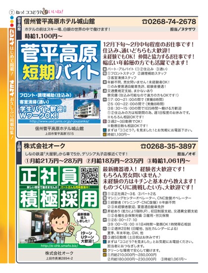 ☎0268-74-2678担当/ヌタザワ12月下旬〜2月中旬程度のお仕事です!住込み、通いどちらも大歓迎!未経験でもOK!仲間と協力するお仕事です!幅広い年齢層の方でも活躍できます!パート・アルバイト(①②住込み③通い)①フロントスタッフ②調理補助スタッフ③客室清掃スタッフ年齢不問、男女問いません!未経験者OK!①のみ要普通自動車免許、経験者優遇!交通費規定支給、まかないあり尞完備(住込み可能なので遠方の方もOKです!)①7:00〜21:00の間で(実働8時間)②5:00〜22:00の間で(実働8時間)③8:30〜15:00の間で1日5時間〜働ける方歓迎①②住込みの方は短期間の為、週1日程度のお休みです。※もちろん相談OKです!③週2〜3日勤務でOK!※勤務日数も相談OKです!まずは「ココどう?」を見ました!とお気軽にお電話下さい。時給1,100円〜☎0268-35-3897しなの鉄道「大屋駅」から車で5分、デリシア丸子店様近くです!①月給21万円〜28万円②月給18万円〜23万円③時給1,061円〜担当/オギ正社員積極採用新しい環境で働きませんか!ートさんも同時集中!最新機器導入しました!IターンUターン大歓迎!http://e-ohk.smafo.biz/株式会社オーク上田市長瀬2894-2最新機器導入!経験者大歓迎です!もちろん男女問いません♪未経験の方はキチンと基本から教えます!ものづくりに挑戦したい方、大歓迎です!①②正社員2〜3名③パート2名マシニングセンターオペレーター、CNC旋盤オペレーター①経験者(マシニング・CNC旋盤)※年齢不問②③未経験者歓迎、要普通自動車免許昇給あり(能力により随時UP)、初回制服支給、交通費全額支給①②各種社会保険完備③雇用・労災保険①②8:00〜17:10③9:00〜15:00※1日4時間〜勤務OK!時間帯応相談①②週休2日制(日曜他、当社カレンダーによる)夏季、年末年始、GW、他③週5日勤務(土日祝はお休みです)まずは「ココどう?を見ました」とお気軽にお電話ください。担当者におつなぎします。クリーンな環境で安心して働けます。①月給210,000円〜280,000円②月給180,000円〜230,000円③時給1,061円〜信州菅平高原ホテル城山館ホテルの前はスキー場、白銀の世界の中で働けます!時給1,100円〜菅平高原短期バイトねっ!ココどう?菅平高原7●●●フロント・調理補助(住込み)客室清掃(通い)学生バイト歓迎!WワークOK!http://www.ued.janis.or.jp/~jouzanka/信州菅平高原ホテル城山館上田市菅平高原1515株式会社オーク上田市はじめて掲載!お久しぶり掲載特集!