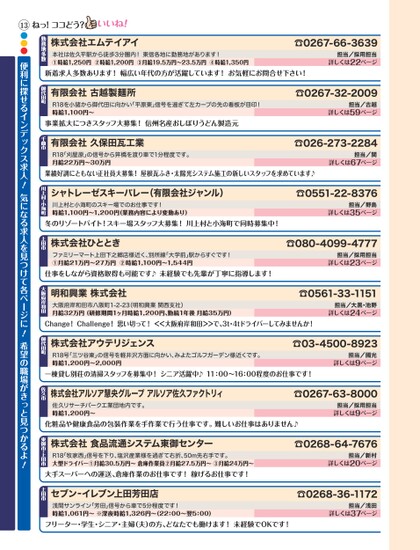 ☎0267-66-3639担当/採用担当詳しくは22ページ株式会社エムテイアイ本社は佐久平駅から徒歩3分圏内!東信各地に勤務地があります!①時給1,250円②時給1,200円③月給19.5万円〜23.5万円④時給1,350円勤務地多数新着求人多数あります!幅広い年代の方が活躍しています!お気軽にお問合せ下さい!☎0267-32-2009担当/古越詳しくは59ページ☎026-273-2284担当/関詳しくは67ページ有限会社古越製麺所R18を小諸から御代田に向かい「平原東」信号を過ぎて左カーブの先の看板が目印!時給1,100円〜御代田町事業拡大につきスタッフ大募集!信州名産おしぼりうどん製造元有限会社久保田瓦工業R18「刈屋原」の信号から笄橋を渡り車で1分程度です。月給22万円〜30万円千曲市☎0551-22-8376担当/野島詳しくは35ページ冬のリゾートバイト!スキー場スタッフ大募集!川上村と小海町で同時募集中!シャトレーゼスキーバレー(有限会社ジャンル)川上村と小海町のスキー場でのお仕事です!時給1,100円〜1,200円(業務内容により変動あり)川上村・小海町☎080-4099-4777担当/採用担当詳しくは23ページ仕事をしながら資格取得も可能です♪未経験でも先輩が丁寧に指導します!株式会社ひとときファミリーマート上田下之郷店様近く、別所線「大学前」駅からすぐです!①月給21万円〜27万円②時給1,100円〜1,544円上田市☎0561-33-1151担当/大黒・池野詳しくは24ページ明和興業株式会社大阪府岸和田市八阪町1-2-23(明和興業関西支社)月給32万円(研修期間1ヶ月時給1,200円、勤続1年後月給35万円)大阪府岸和田Change!Challenge!思い切って!<<大阪府岸和田>>で、3t・4tドライバーしてみませんか!☎03-4500-8923担当/國光詳しくは9ページ株式会社アウテリジェンスR18号「三ツ谷東」の信号を軽井沢方面に向かい、みよたゴルフガーデン様近くです。時給1,200円〜2,000円御代田町一棟貸し別荘の清掃スタッフを募集中!シニア活躍中♪11:00〜16:00程度のお仕事です!☎0267-63-8000担当/採用担当詳しくは9ページ株式会社アルソア慧央グループアルソア佐久ファクトリィ佐久リサーチパーク工業団地内です。時給1,200円〜佐久市化粧品や健康食品の包装作業を手作業で行う仕事です。難しいお仕事はありません♪業績好調にともない正社員大募集!屋根瓦ふき・太陽光システム施工の新しいスタッフを求めています♪☎0268-64-7676担当/新村詳しくは20ページ☎0268-36-1172担当/浅田詳しくは37ページフリーター・学生・シニア・主婦(夫)の方、どなたでも働けます!未経験でOKです!セブン‐イレブン上田芳田店浅間サンライン「芳田」信号から車で5分程度です!時給1,061円〜※深夜時給1,326円〜(22:00〜翌5:00)上田市株式会社食品流通システム東御センターR18「牧家西」信号を下り、塩沢産業様を過ぎて右折、50m先右手です。大型ドライバー①月給30.5万円〜倉庫作業員②月給27.5万円〜③月給24万円〜東御市・上田市大手スーパーへの運送、倉庫作業のお仕事です!稼げるお仕事です!ねっ!ココどう?13●●●便利に探せるインデックス求人!気になる求人を見つけて各ページに!希望の職場がきっと見つかるよ!