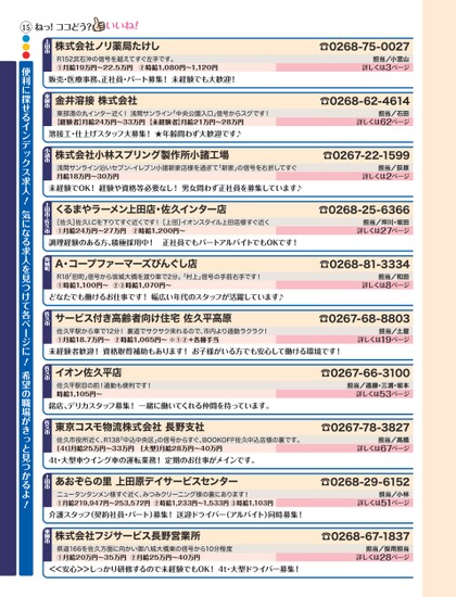 ☎0268-75-0027担当/小宮山詳しくは3ページ☎0268-62-4614担当/石田詳しくは62ページ東部湯の丸インター近く!浅間サンライン「中央公園入口」信号からスグです!【経験者】月給24万円〜33万円【未経験者】月給21万円〜28万円溶接工・仕上げスタッフ大募集!★年齢問わず大歓迎です♪金井溶接株式会社東御市販売・医療事務、正社員・パート募集!未経験でも大歓迎!株式会社ノリ薬局たけしR152武石沖の信号を越えてすぐ左手です。①月給19万円〜22.5万円②時給1,080円〜1,120円上田市ねっ!ココどう?☎0267-22-1599担当/荻原詳しくは2ページ株式会社小林スプリング製作所小諸工場浅間サンライン沿いセブン-イレブン小諸新家店様を過ぎて「新家」の信号を右折してすぐ月給18万円〜30万円小諸市未経験でOK!経験や資格等必要なし!男女問わず正社員を募集しています♪☎0268-25-6366担当/坪川・坂田詳しくは27ページ☎0268-81-3334担当/和田詳しくは8ページ☎0267-68-8803担当/土屋詳しくは19ページ調理経験のある方、積極採用中!正社員でもパートアルバイトでもOKです!どなたでも働けるお仕事です!幅広い年代のスタッフが活躍しています♪A・コープファーマーズびんぐし店R18「田町」信号から坂城大橋を渡り車で2分。「村上」信号の手前右手です!①時給1,100円〜②③時給1,070円〜坂城町サービス付き高齢者向け住宅佐久平高原佐久平駅から車で12分!裏道でサクサク来れるので、市内より通勤ラクラク!①月給18.7万円〜②時給1,065円〜※①②+各種手当佐久市くるまやラーメン上田店・佐久インター店[佐久]佐久I.Cを下りてすぐ近くです![上田]イオンスタイル上田店様すぐ近く①月給24万円〜27万円②時給1,200円〜上田市・佐久市☎0267-66-3100担当/遠藤・三浦・坂本詳しくは53ページ☎0267-78-3827担当/高橋詳しくは67ページ佐久市役所近く、R138「中込中央区」の信号からすぐ、BOOKOFF佐久中込店様の裏です。[4t]月給25万円〜33万円[大型]月給28万円〜40万円東京コスモ物流株式会社長野支社佐久市銘店、デリカスタッフ募集!一緒に働いてくれる仲間を待っています。イオン佐久平店佐久平駅目の前!通勤も便利です!時給1,105円〜佐久市☎0268-29-6152担当/小林詳しくは51ページ介護スタッフ(契約社員・パート)募集!送迎ドライバー(アルバイト)同時募集!あおぞらの里上田原デイサービスセンターニュータンタンメン様すぐ近く、みつみクリーニング様の裏にあります!①月給219,947円〜253,572円②時給1,233円〜1,533円③時給1,103円上田市☎0268-67-1837担当/採用担当詳しくは28ページ<<安心>>しっかり研修するので未経験でもOK!4t・大型ドライバー募集!株式会社フジサービス長野営業所県道166を佐久方面に向かい御八城大橋東の信号から10分程度①月給20万円〜35万円②月給25万円〜40万円東御市4t・大型車ウイング車の運転業務!定期のお仕事がメインです。未経験者歓迎!資格取得補助もあります!お子様がいる方でも安心して働ける環境です!15●●●便利に探せるインデックス求人!気になる求人を見つけて各ページに!希望の職場がきっと見つかるよ!